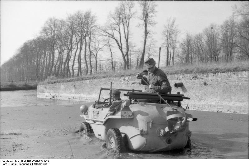 Динамика у KdF-166 была, естественно, поскромнее, нежели у, допустим, Porsche 911, но 10 км/ч на воде автомобиль выдавал исправно, а это и для наших дней показатель весьма достойный. В общем, на Schwimmwagen можно было бесстрашно пересекать реки, озера и прочие водоемы, стоило опасаться лишь ветреной погоды (дабы набежавшая волна не потопила автомобиль) и шальной пули (единственного попадания в кузов ниже ватерлинии хватало, чтобы пустить водоплавающий "Фольксваген" ко дну).
