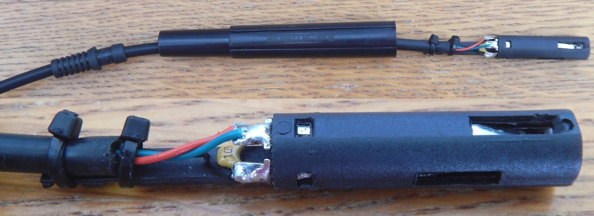 Сама ручка паяльника состоит из пары-тройки пластмассовых деталек и антискользящий резиновой накладки. Внутри ручки патрон с контактами и конденсатор, расположенный между плюсовым и минусовым контактами.