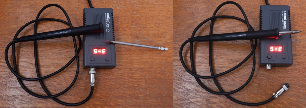 Если вытащить жало или вообще отключить паяльник, станция выдает на дисплей ошибку S-E, что говорит об обрыве питания в цепи нагревателя.