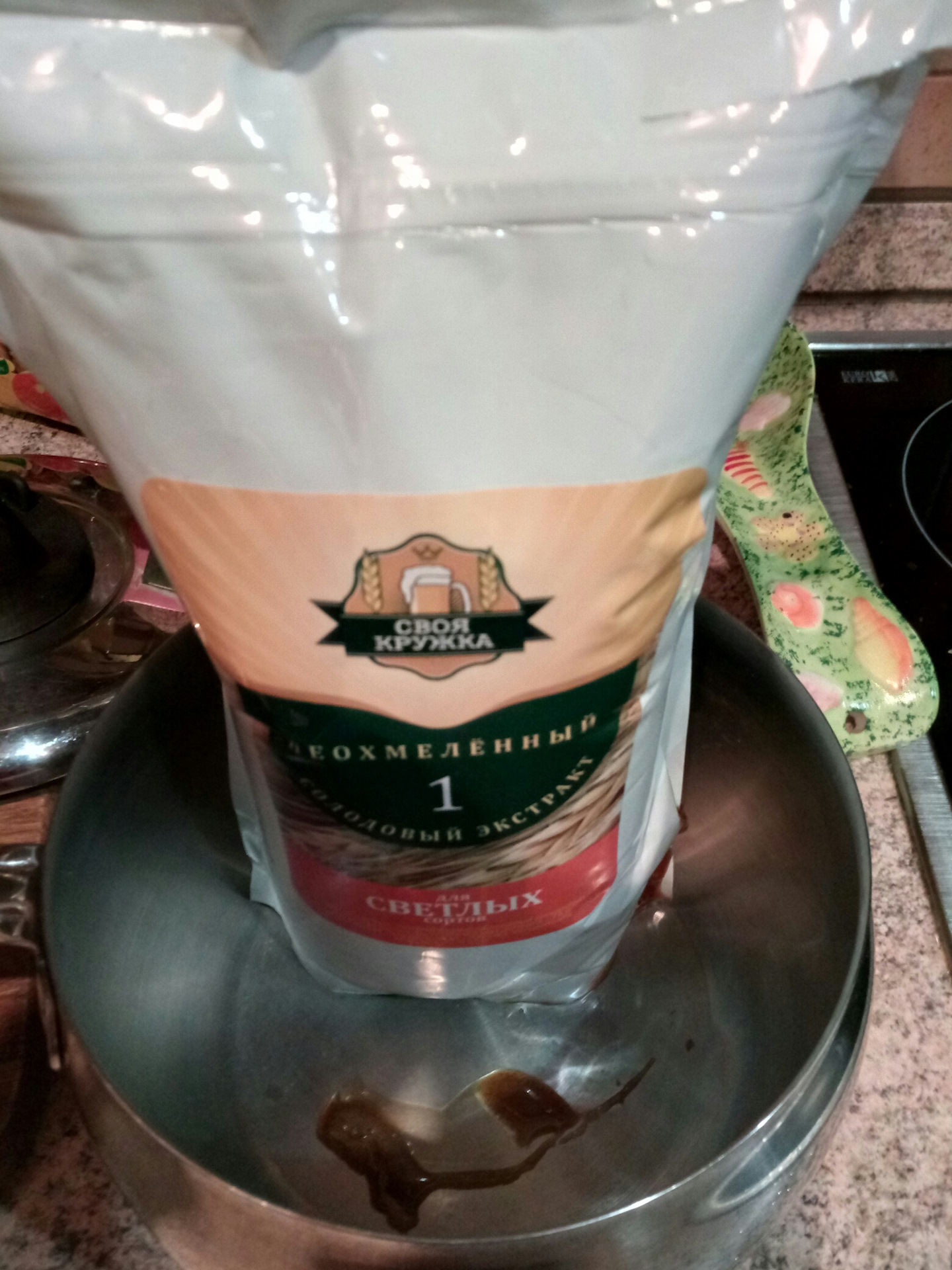 Давно я хотел попробовать "нашего производителя". В плюсах дешевизна. В минусах, то что наш производитель так и не научился запечатывать результаты своего труда. Через месяц хранения упаковка вздулась. Ну да ладно, поскольку набор с неохмеленкой мне все равно варить. И так в наборе