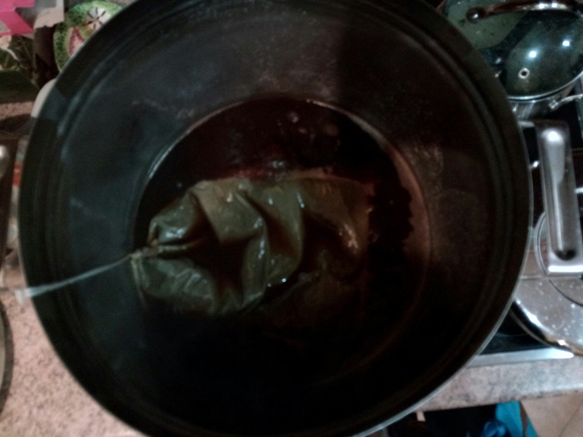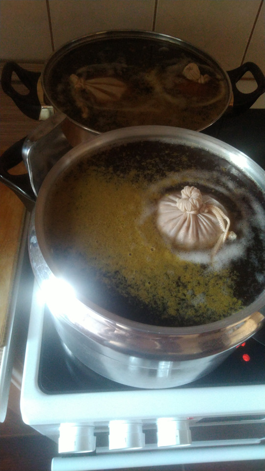 Этап первый налил в кастрюлю воду, добавил неохмеленку, поставил закипать. Кастрюлю предварительно дезинфицировал раствором деохлора (необязательно). После закипания добавил хмель1 в мешочке.