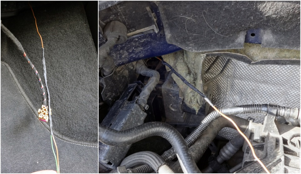 Теперь берем проволоку по-толще и аккуратно ее проталкиваем в подкапотное пространство. Нужно стараться, чтобы проволока была в над жгутом проводов — так легче. После тока как протолкнули проволоку и смогли дотянуться до нее в подкапотном пространстве, приматываем нужный провод (я еще сверху немного силиконом смазал, чтобы легче шло).
