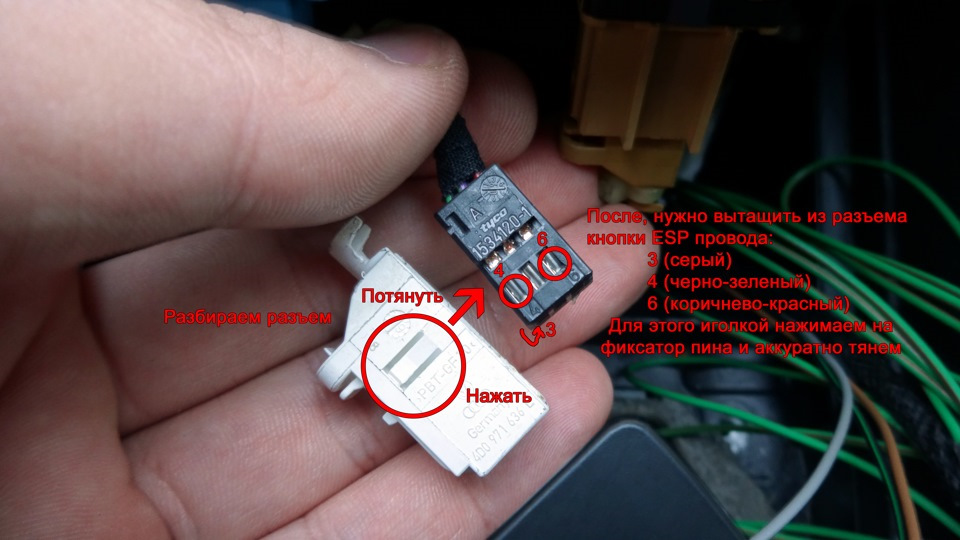 Теперь нужно разобрать разъем кнопки ESP и вытащить из него с помощью иглы провода 3, 4 и 6 (нумерация на разъеме присутствует).