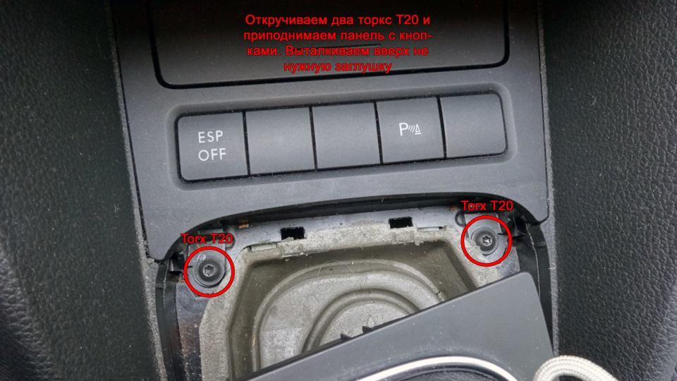 После снятия крышки КПП откроется доступ к двум винтам Torx T20, которые держат панель с кнопками. Окручиваем, приподнимаем панель и выталкиваем наружу ненужную заглушку.