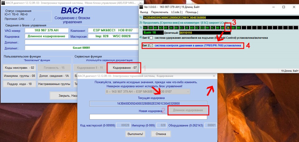 Приматываем провод к основному жгуту проводов изолентой. Собираем и подключаем разъем блока ABS. Всё! На этом "тяжелый" физический труд окончен. Теперь нужно активировать систему косвенного контроля давления в шинах с помощью диагностического адаптера Вася-диагност или подобным. Для этого заходим в "03 — Электроника тормозной системы" — "07 — Кодирование" — "Длинное кодирование" — "Байт 16" и отмечаем "Бит 2 — система контроля давления в шинах (TMPS/PR-7K6) установлена". Закрываем окно длинной кодировки, жмем "Выполнить", потом "ОК".
