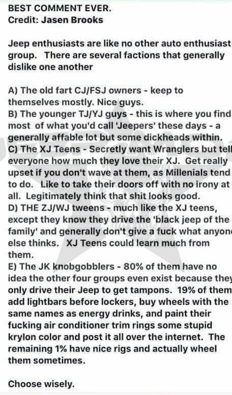 С) Подростки на XJ — Втайне мечтают о Wrangler, но пытаются втирать всем окружающим о том, как сильно они любят свои "чирки". Очень сильно расстраиваются, когда владельцы Wrangler поколения "Пепси" не приветствуют их на дороге фирменным Jeep-Wave. Любят снимать двери со своих ведер, не ставя вообще никакой защиты взамен и думают, что все это дерьмо выглядит очень круто (что, в общем-то, так и есть);