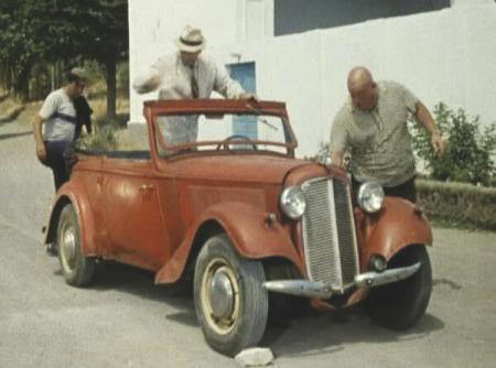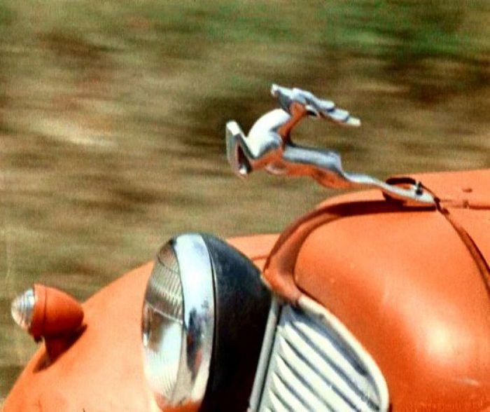 Во-вторых, никаких эмблем или фирменных знаков на автомобиле не имеется, а это также сильно затрудняет распознавание. Возможно, марка, модель и модификация автомобиля так бы и остались загадкой, если бы не то обстоятельство, что это был не студийный реквизитный автомобиль, а личная машина Юрия Никулина. Этот автомобиль назывался Adler Trumpf, именно через «pf», а не через «ph», как его часто ошибочно пишут. Машина эта – немецкая, а не английская, и потому название ее пишется по немецким правилам. И уж ни в коем случае его не следует переводить словом «Триумф», поскольку Trumpf это не триумф, а козырь. Путаница эта вызвана существованием мотоциклов Адлер-Триумф, которые в 1950-х годах фирма Adlerwerke делала по английской лицензии.