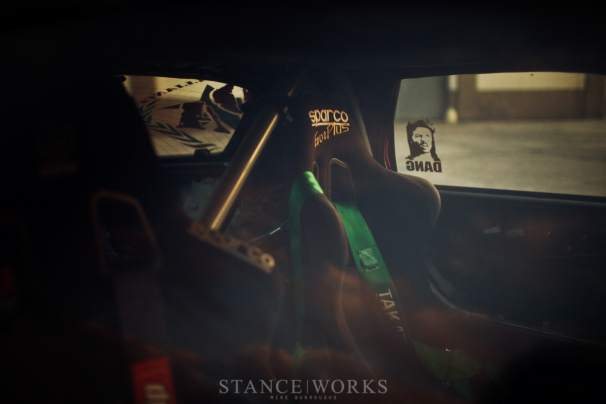 В салоне автомобиля, где Хэрт любит проводить бОльшую часть времени, расположились: трубчатый каркас Blue Star Fabrication, сделанный в Formula Drift spec, рулевое колесо Grip Royal, установленное через переходник NRG Quick Release и Short hub, панель от S14, водительское спортивное сиденье Sparco EVO2 и пассажирское Sparco Sprint 5.
