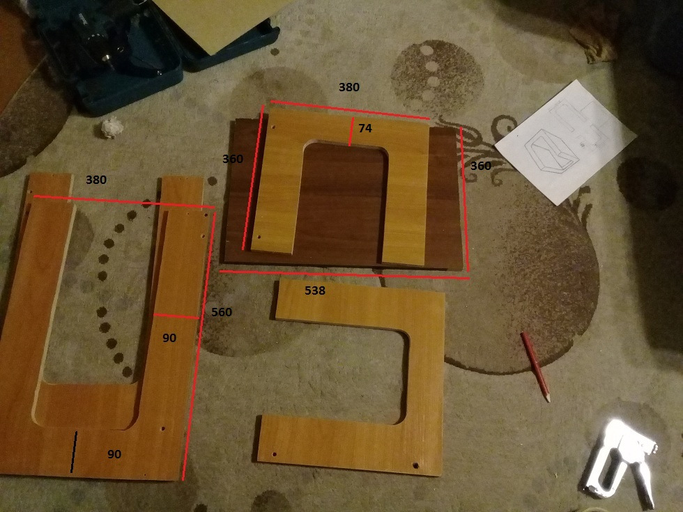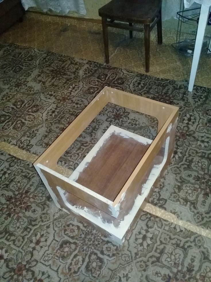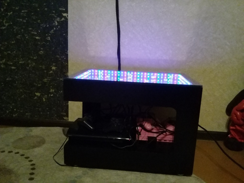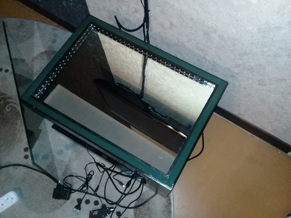 Фото для затравки.Для начала нужно напилить заготовки. Я использовал куски от старого шкафа. Размеры в миллиметрах.Кошки пришли принимать работу. Видимо подумали, что я им новый дом строю)Следующим этапом шпатлюем все сколы после лобзика и отверстия от старых креплений.Покраска каркаса в первый слой.Собрал рамку для зеркала и приклеил к ней ленту.Очень нудный процесс. Обклейка каждого светодиода малярным скотчем.Снова всё выкрашено.Второй по нудности процесс — это оторвать скотч который клеил чуть раньше.Установка контроллера за RGB лентой. ИК приёмник подклеил на скорую руку. В будущем буду думать над грамотным креплением.Хороший удлинитель чтоб подключить всё необходимое.Устанавливаем зеркало и клеем двухсторонний скотч для крепления тонированного стекла чтоб не было рамки. Я лично считаю, что на столе не должно быть бортов за исключением бильярдного. Ещё в этот момент были вклеины стеклянный шары на горячий клей.Ну и всё, стол готов. Любуемся результатом……Вот такой столик. Всем спасибо.