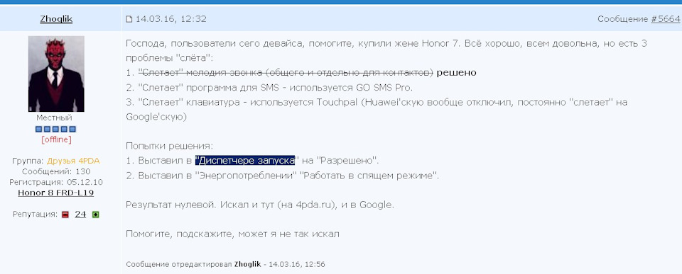 Ребят, помогите советом, телефон Honor 7, андроид 6, при перезагрузке сбрасывает мелодию основную на дефолтную и установленные мелодии. Ничего не шил, не рутовал, просто случилось в один миг. Откатывался, не помогло. Уже и контакты перенес с карты в память, ничего не помогло! Есть какие мысли? Рут не предлагать, дюже мудрено для меня