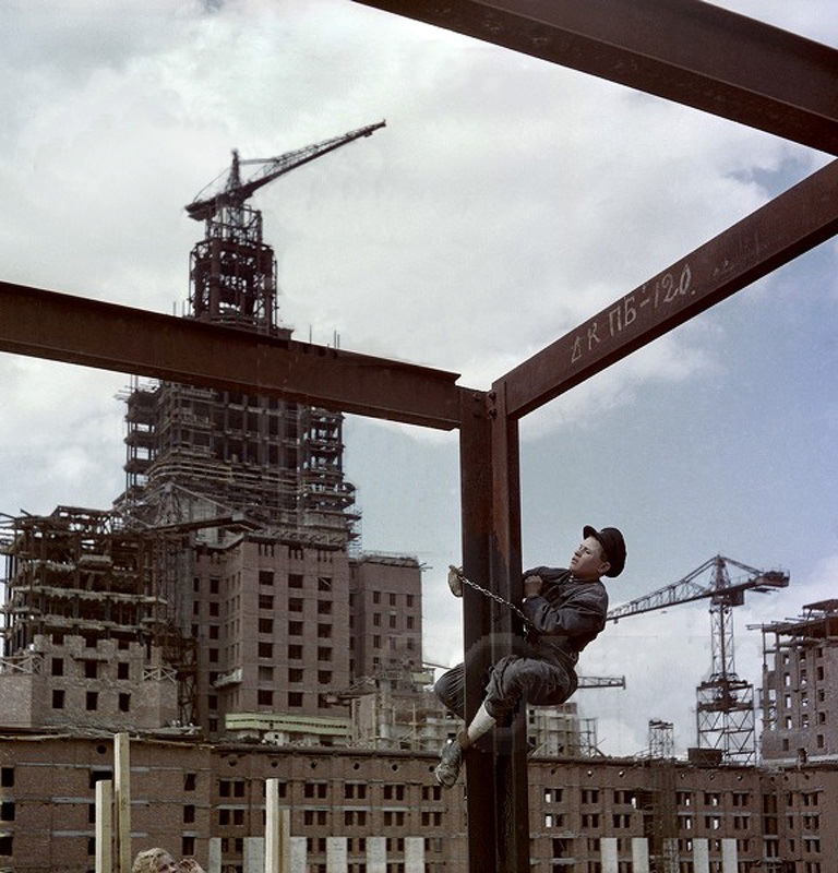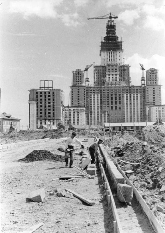 В репортажах с ударной стройки на Ленинских горах сообщалось, что высотку возводят 3000 комсомольцев-стахановцев. Однако в действительности работа здесь была у гораздо больше людей. Специально «под университет» в конце 1948 года в МВД был подготовлен приказ об условно-досрочном освобождении из лагерей нескольких тысяч заключенных, имевших строительные специальности. Этим счастливчикам предстояло провести остаток срока на сооружении МГУ.