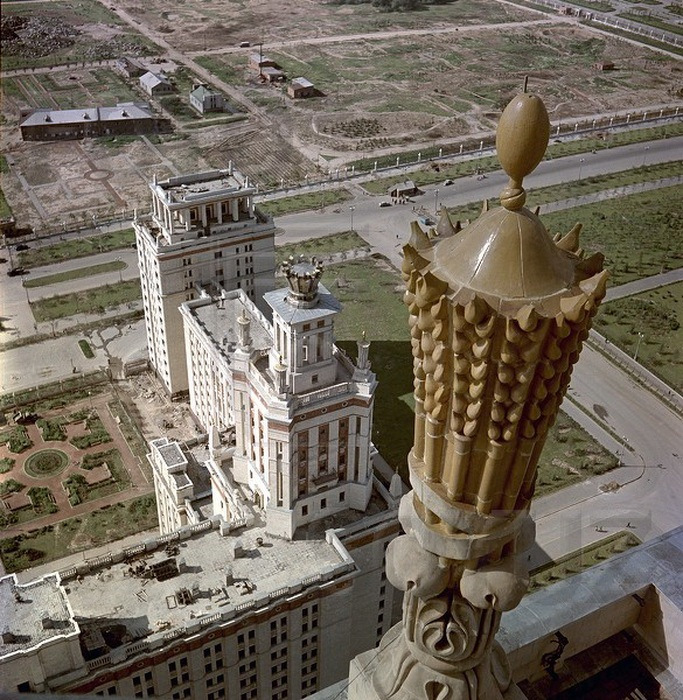 В первоначальном эскизном варианте предполагалось увенчать высотку скульптурой внушительных размеров. Персонаж на листах ватмана был изображен абстрактный – фигура человека с задранной к небу головой и широко раскинутыми в стороны руками. Видимо, такая поза должна символизировать тягу к знаниям. Хотя архитекторы, показывая чертежы Сталину, намекнули, что скульптура может получить портретное сходство с вождем. Однако Иосиф Виссарионович распорядился соорудить вместо статуи шпиль, чтобы верхняя часть здания МГУ была похожа на остальные шесть высоток, строящихся в столице.