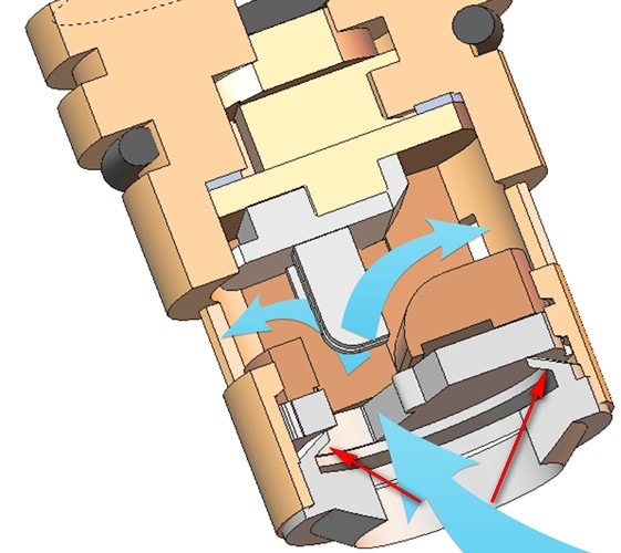 на немецких кранбуксах вот эта красная прокладка сделана совсем по другому, и как я понял, давлением воды юбку (красные стрелки на схеме) прокладки прижимает к керамике и герметизирует весь пакет, потому и крутятся эти кранбуксы совсем без усилия