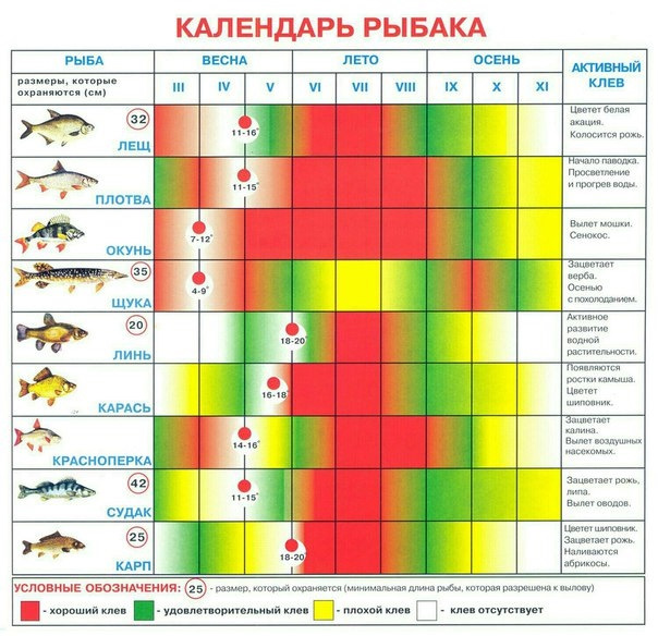 Условная очень таблица, клев сильно зависит от уровня воды, в наших краях точно. Если вода как в прошлом году будет большая, и до июля будет не спадать, то все эти табличные данные не сработают — в прошлом году до конца июля на реках было с клевом грустно, из за половодья и разлива рыбе и так было где кормиться, и на привычных местах ее просто не было, а если и была то клевала ооочень лениво.