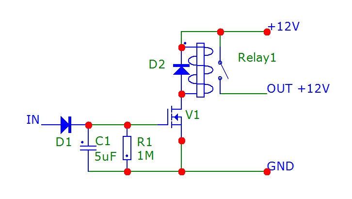 ещё можно добавить ПОС для чёткого срабатывания, без сваливания в линейный режим. Я в своё время делал себе такое для эл-помпы, чтобы гоняла жижу вместе с зажиганием + 5 минут поле его выключения