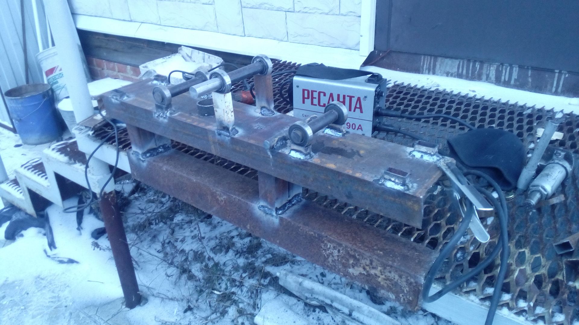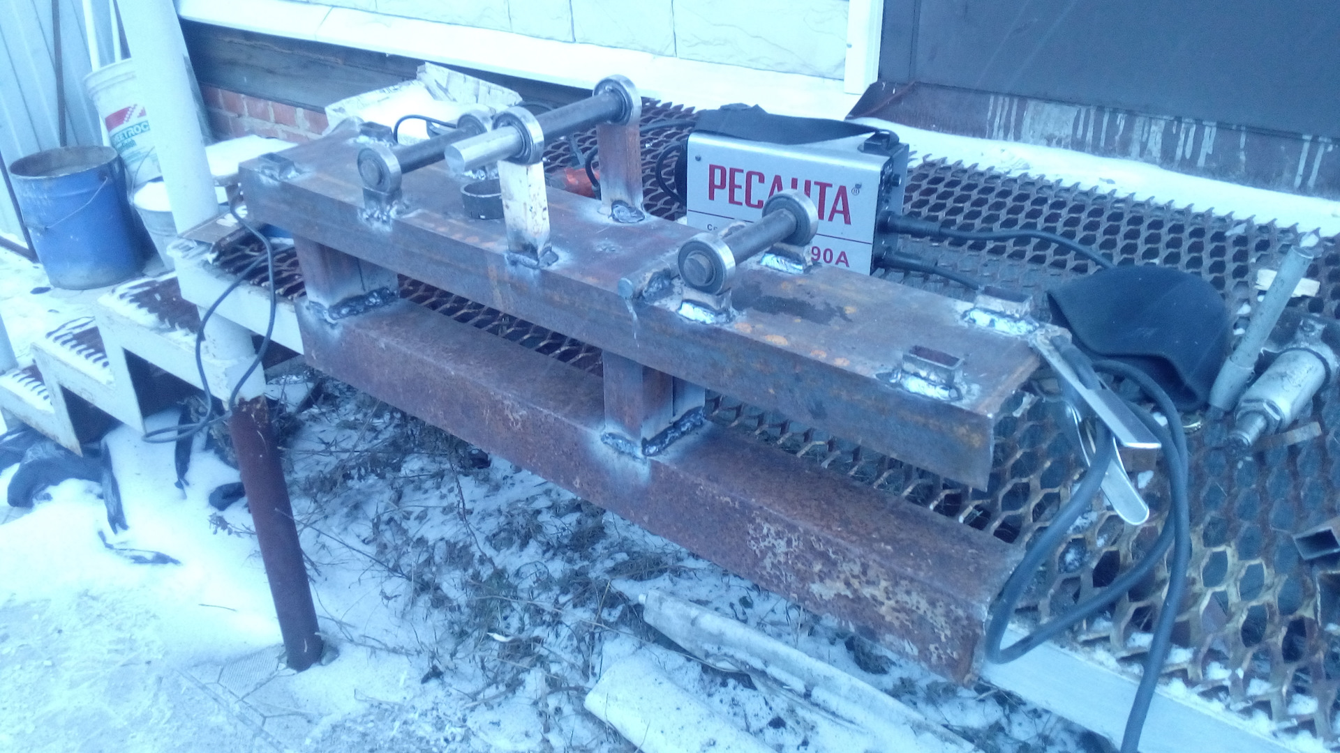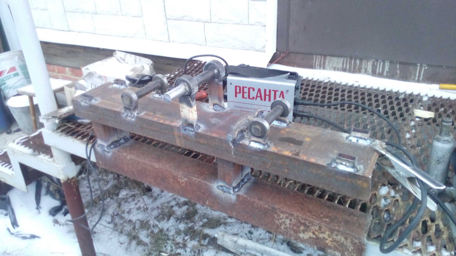 Круто! Я тоже собираю подобный, тоже на швелере, только валы точил из кругляка на 50, подшипники 205ые. Но в планах делать горизонтально, неудобно вверх длинные изделия поднимать.