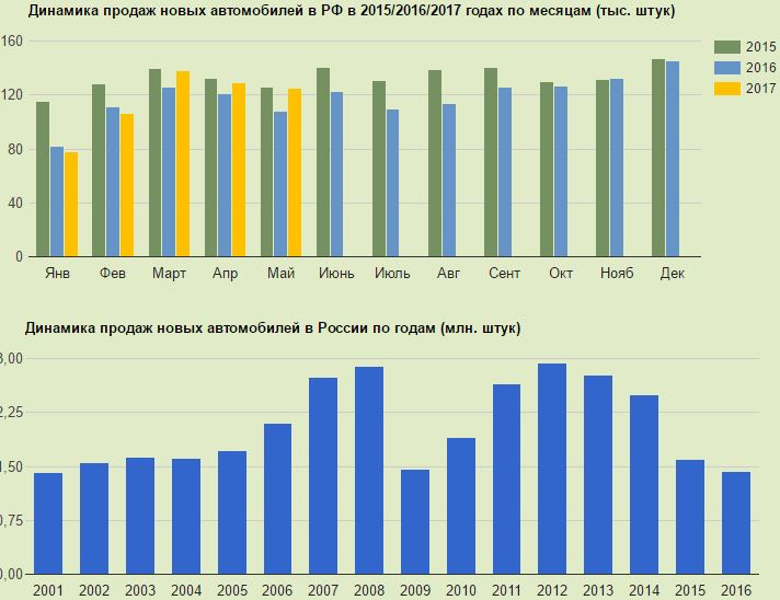 Согласно статистики продаж в мае 2017 года в России продано 125 тысяч новых легковых и легких коммерческих автомобилей, что на 14,7% больше чем в мае 2016 года и на 3,5% меньше предыдущего месяца.