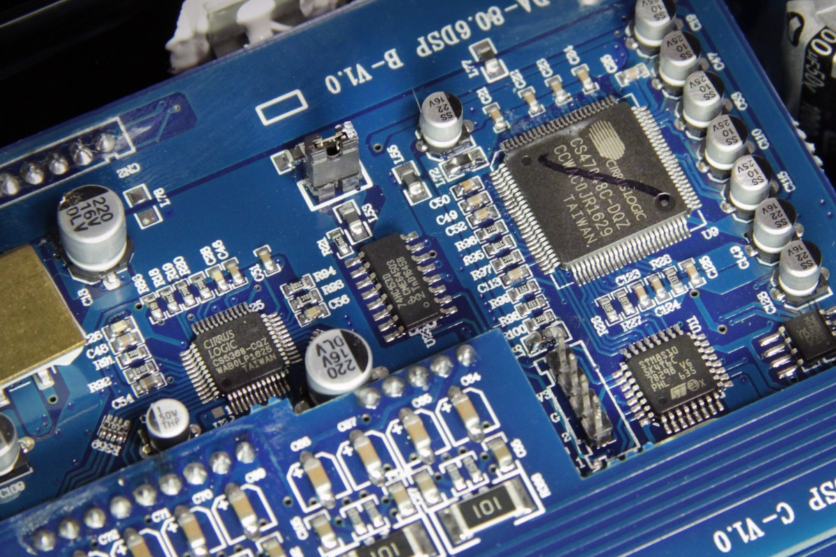 А вот и сама процессорная часть. Уже знакомый по многим процессорам среднего класса "камень" Cirrus Logic CS47048C-DQZ в связке с 8-канальным АЦП CS5368. Отдельного ЦАП здесь нет, используется встроенный в процессорный чип.