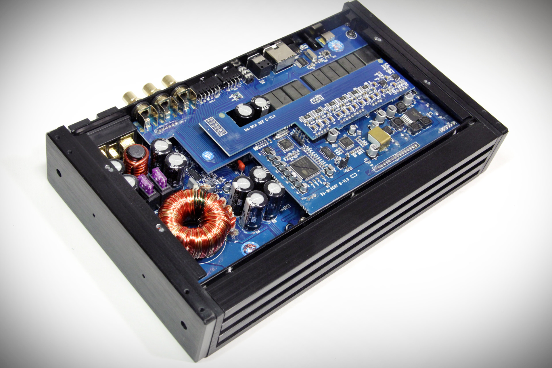 Отверстия на боковых стенках – под дополнительные крепления, с которыми усилители можно смонтировать в несколько "этажей". В серии планируется выпуск "обычного" 6-канальника без процессора и моноблока – оба в точно таких же корпусах, что и AMP DA-80.6DSP.
