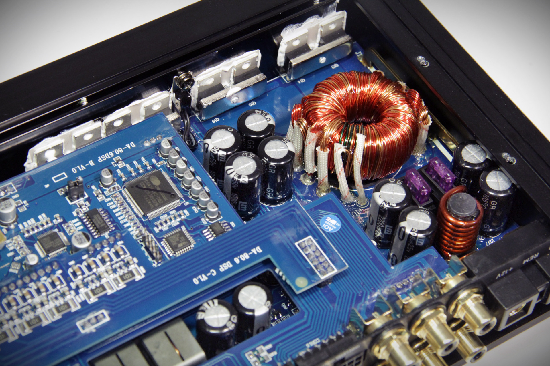 Силовые ключи и диодные мосты блока питания расположены вдоль задней стенки. Всё говорит о том, что "звуковая сила" находится под нижней платой и прижата непосредственно к плоскости корпуса.