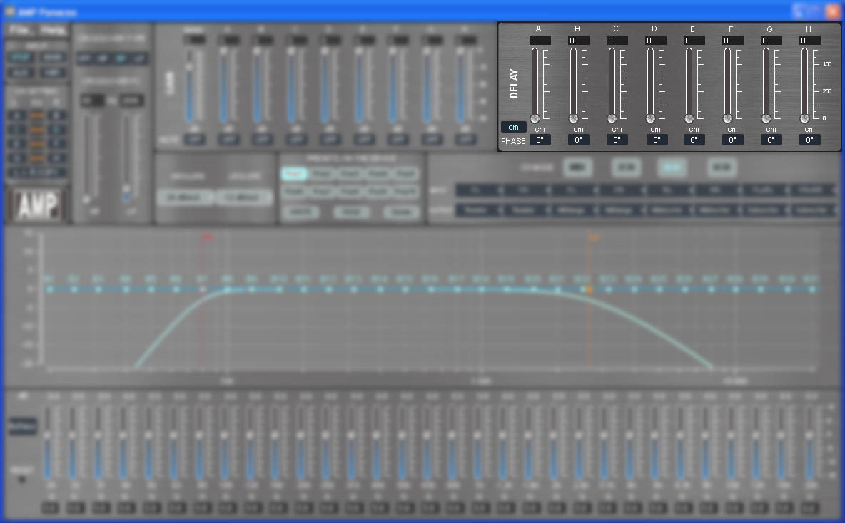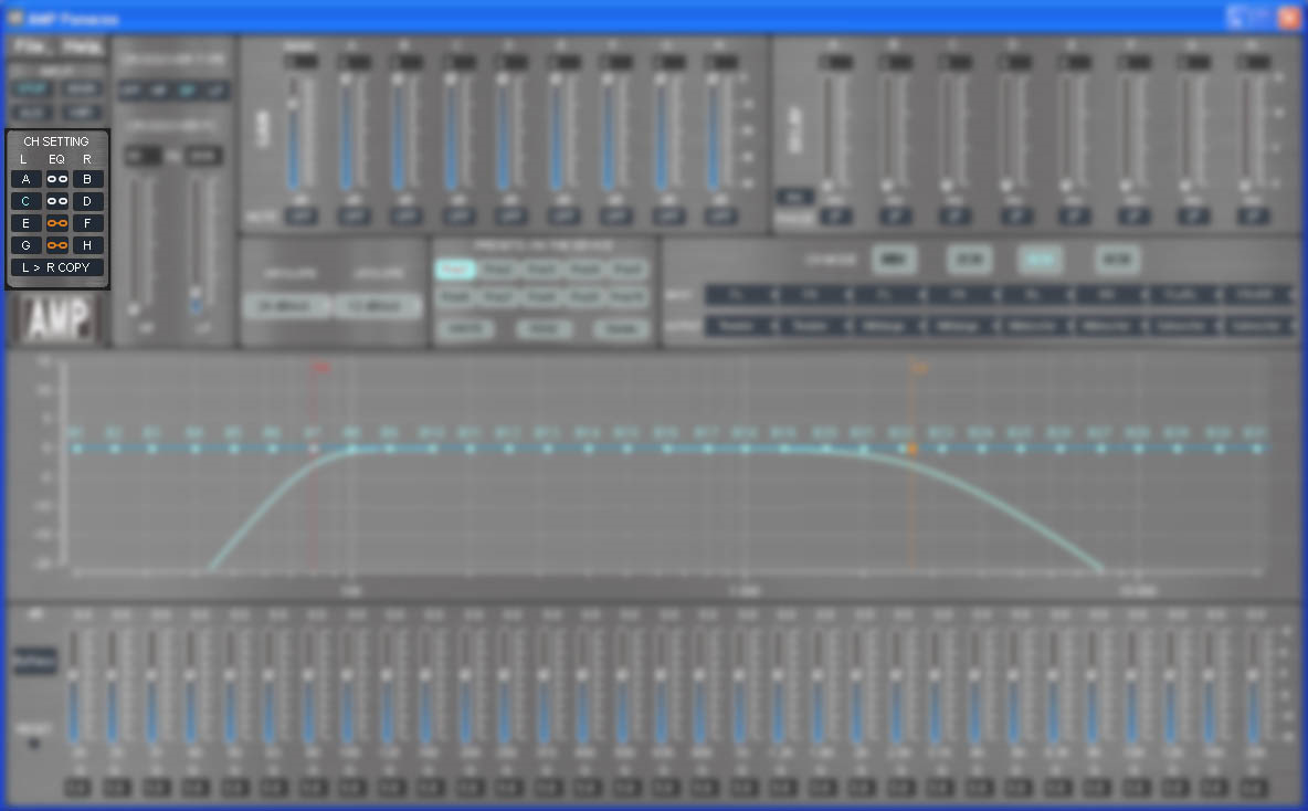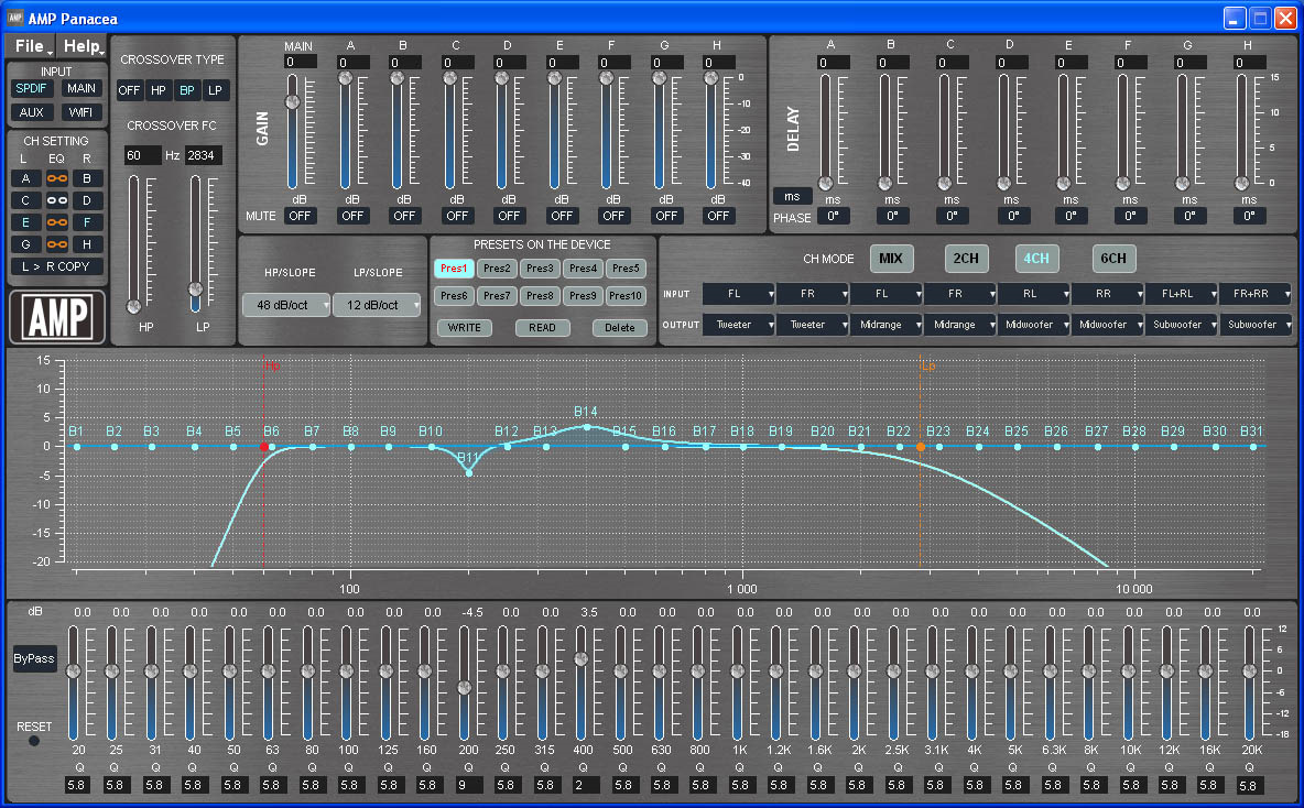 Шесть каналов процессора, которые работают на встроенный усилитель, настраиваются безо всяких ограничений. Каналы G и H (выходы на отдельный усилитель) имеют ограничение по эквалайзеру – вместо 31 полосы доступна регулировка только в 11 первых полосах (до 200 Гц). Вполне логично, если уж и будет необходимость подключить внешний усилитель, то с большой вероятностью это будет сабвуферный моноблок. Впрочем, по фильтрам в этих каналах ограничений всё равно никаких.