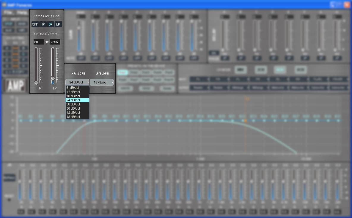 Частоту настройки фильтров можно выставлять с точностью до 1 Гц. Крутизну – вплоть до 48 дБ/октава. Добротность – баттервортовская. Выбор типа фильтра (Бессель, Линквиц-Райли и т.п.) не предусмотрен.