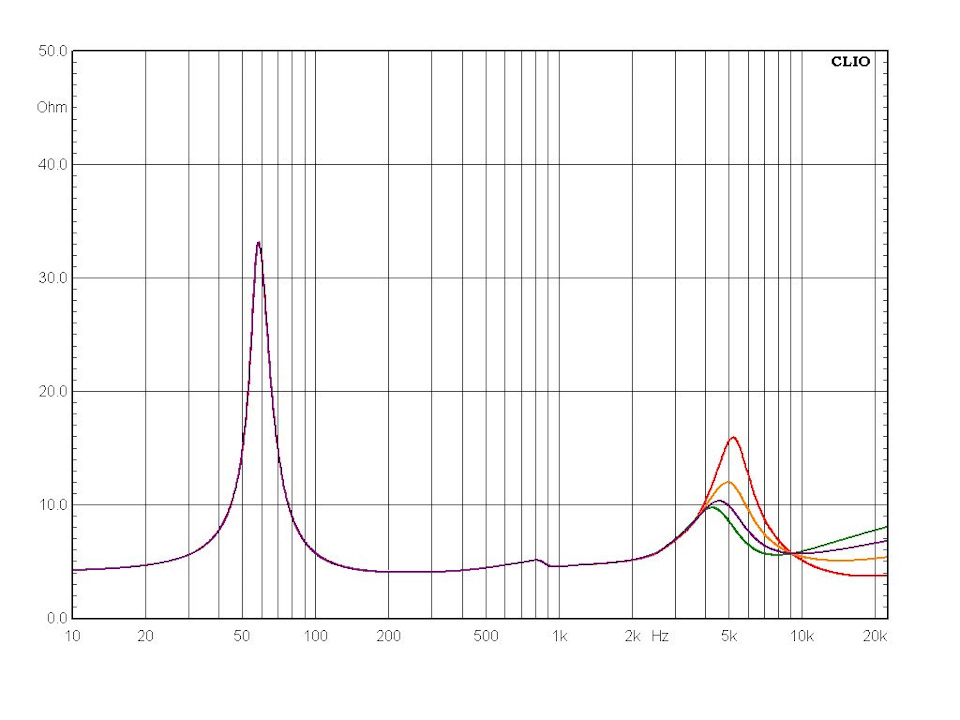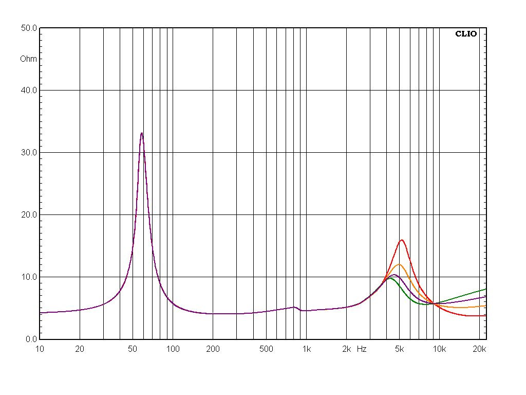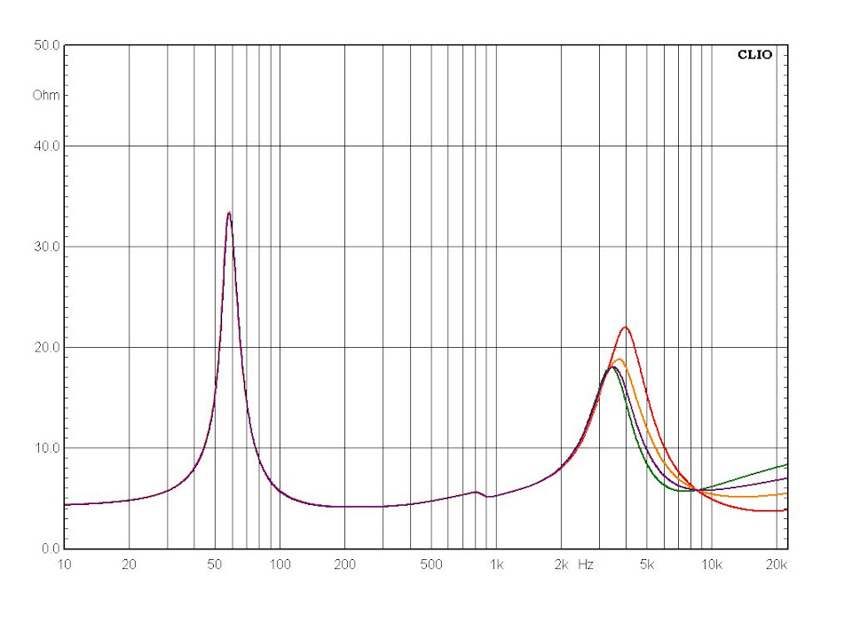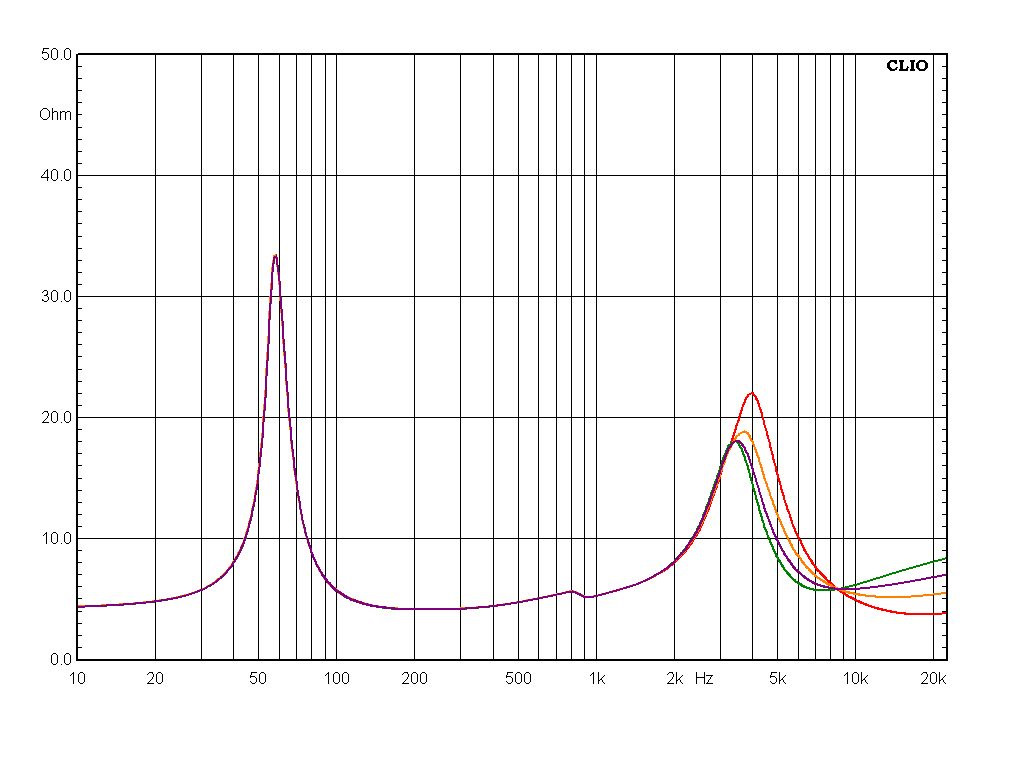 Включение через кроссовер, кстати, заметно меняет характер импеданса НЧ/СЧ динамика на нижних частотах. Ничего не поделаешь, лишнее сопротивление всегда сказывается на демпфировании. Импедансные кривые снял при всех возможных вариантах перемычек: