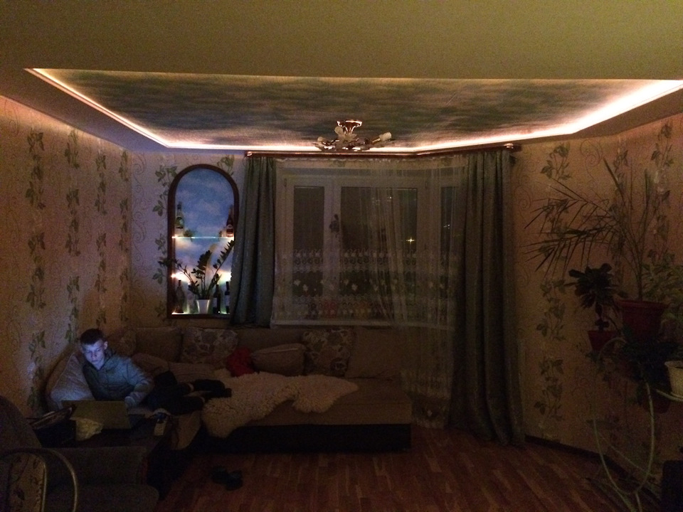 Единственный минус, такой подсветки, когда светодиодная лента светит вдоль потолка, вылазят все огрехи отделки потолка, даже на этой фотографии, весь потолок в буграх и ямах…