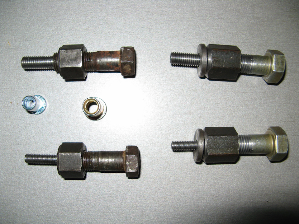 Всех с наступающим Новым Годом.Подсмотрел здесь на драйве самодельный клепальщик для резьбовых заклепок сделал но не очень понравилось.Пока заклепка не зажата в метале она проварачивается, и выкручивается.Решил чуть усовершенствовать, и нарезать на болту и гайке левую резьбу, теперь при провороте она наоборот зажимается — идут навстречу друг другу. В первом случае болты использовал (то что валялось в гараже под ногами) от крепления верхнего рычага подвески Москвич они крепкие с буквой Х а гайки ГБЦ тоже москвича -они крепкие и широкие шаг резьбы 1,25.Слева на фото первоначальные а справа доработаные с левой резьбой Это не професиональный инструмент но заклепать несколько заклепок вполне можно