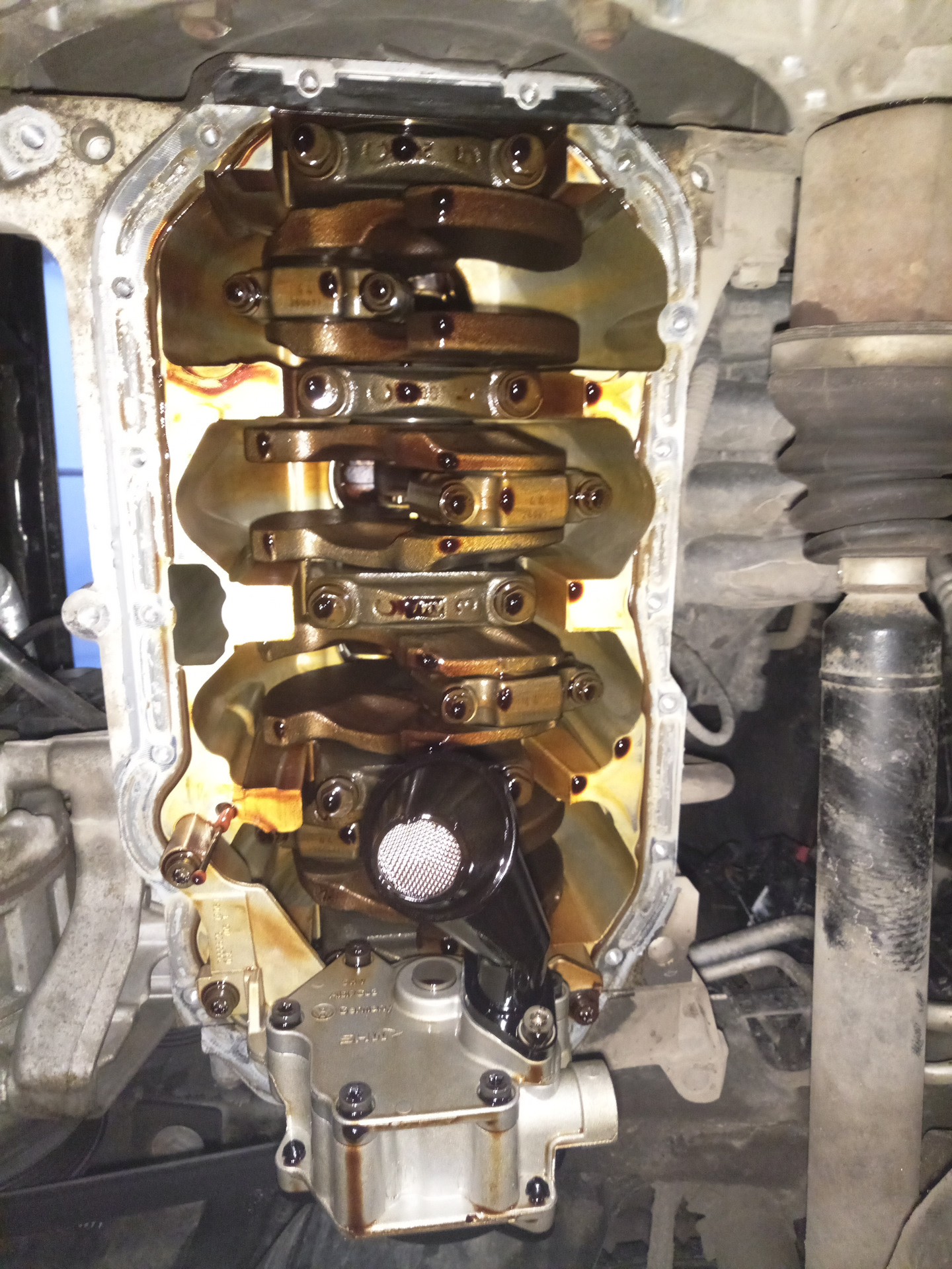20. Ставим новый/контрактный маслонасос, затягиваем 3 его болта (25 Нм). Ставим звезду — новый болт (20 Нм + 90 градусов), ставим пластиковый кожух. Приклеиваем поддон, собираем все на новые болты, гайки и прокладки. На шпильки выхлопа мажем медную пасту. Даем герметику время высохнуть.