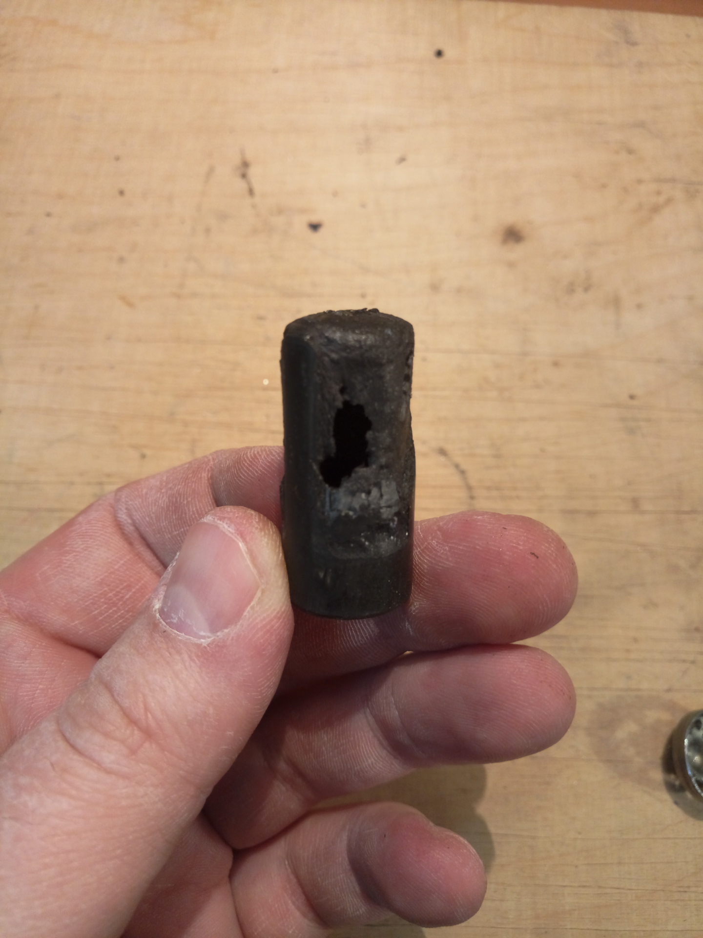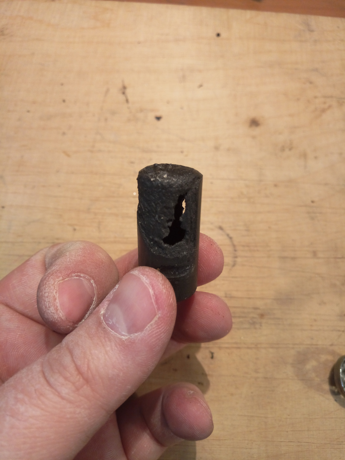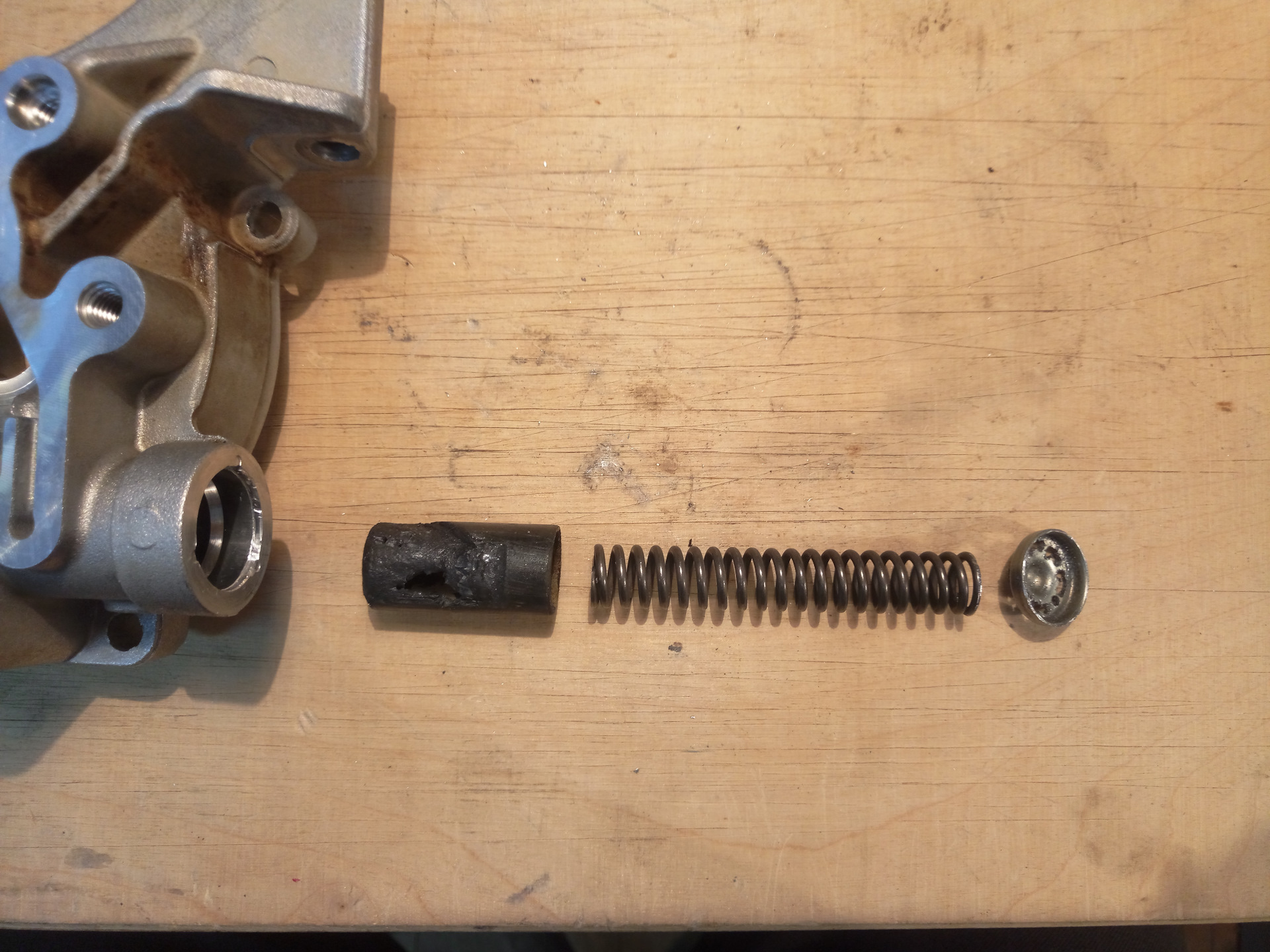 Тут я его разобрал и увидел там завальцованный пластиковый подпружиненный клапан. Который отдимексидился до того, что размяк, распух и перестал двигаться, а также крошился от легкого контакта с отверткой. Соответственно маслонасос не давил в канал, а болтал масло в поддоне.