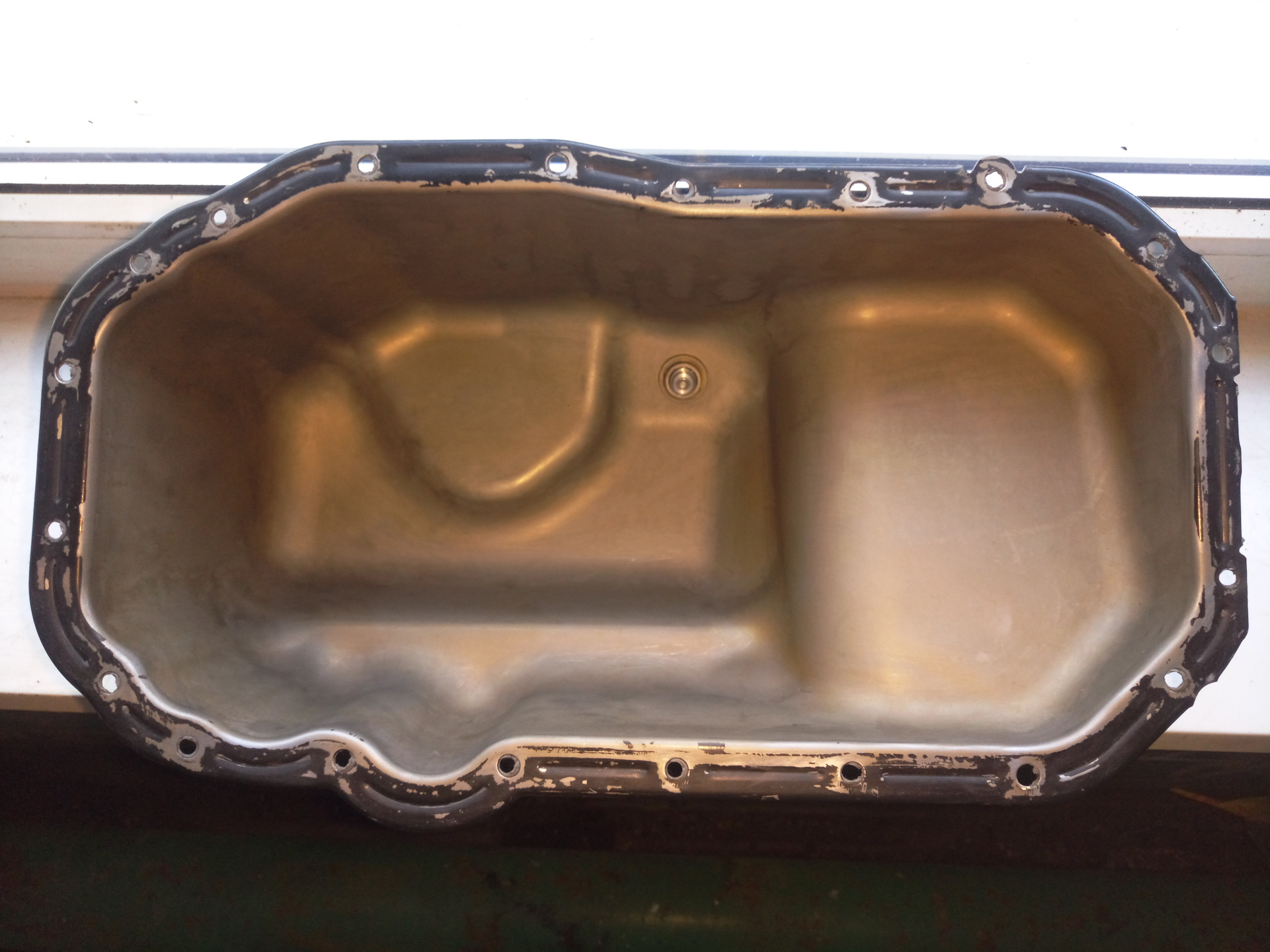 7. Мотор свободен от краски — можно продолжать дальше. Клеим поддон на герметик на старые болты (13 Нм). Собираем выхлоп на старую прокладку и старые медные гайки (40 Нм) и старый хомут (25 Нм). Даем время герметику высохнуть (в идеале — сутки).