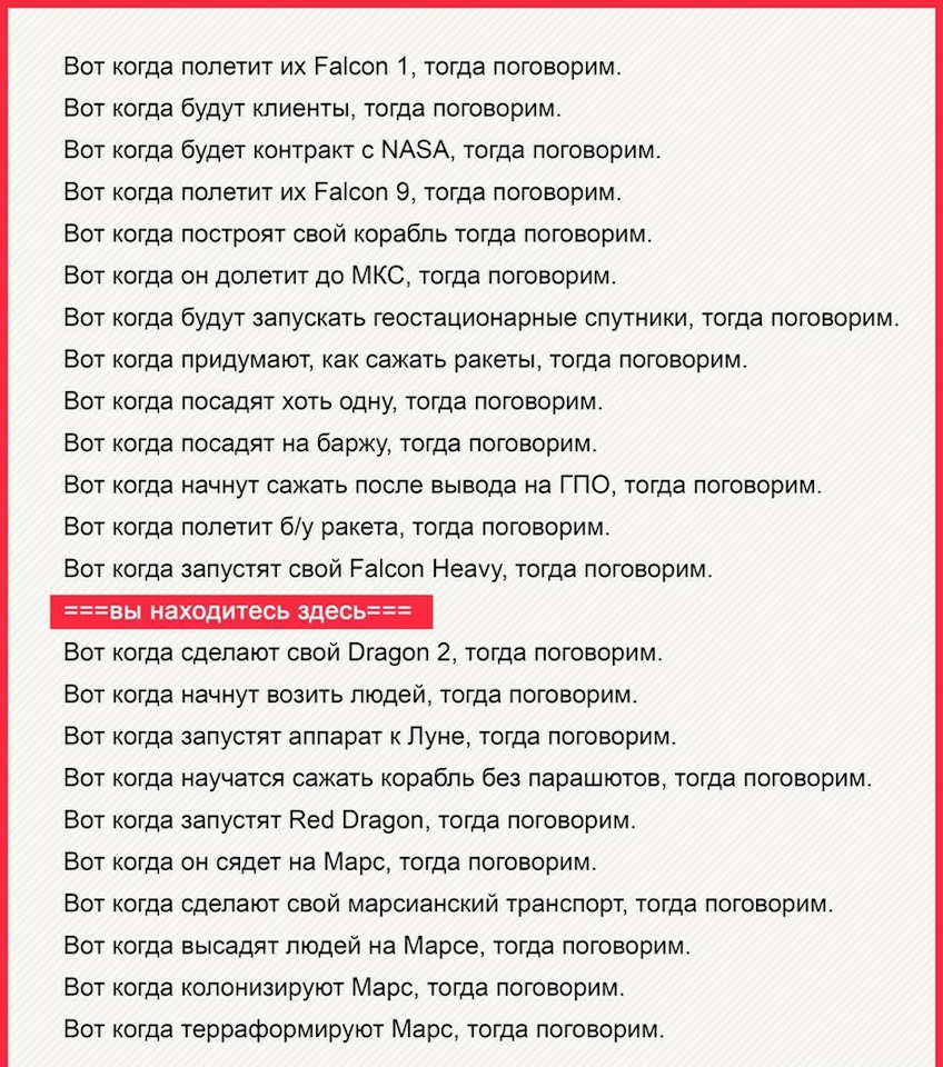 Забыл добавить, всегда бесили подобные выражения : " Пользу человечеству…, и т.д и т.п ". Какую пользу? Электромобиль ? Бедные негры рассекают по Америке на халявной Тесле? Или благодаря этому пуску Америка и её среднее население стало жить богаче? Нет ! Это, тот же Прохоров, с Емобилем, только по Американски.
