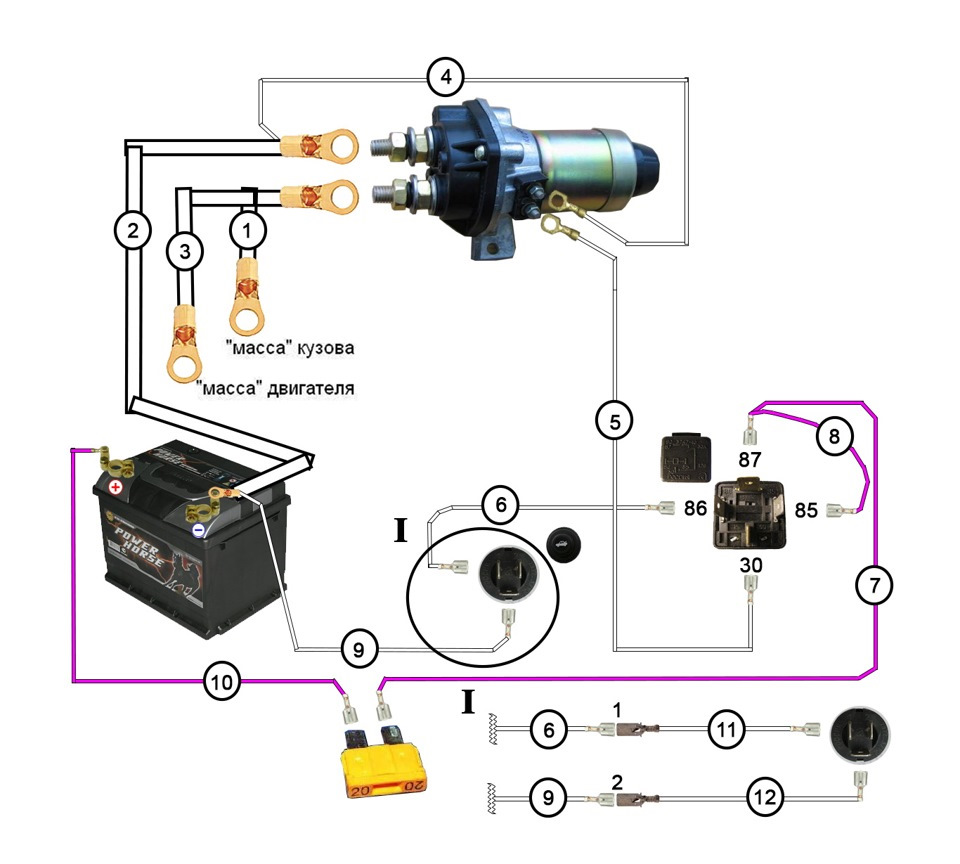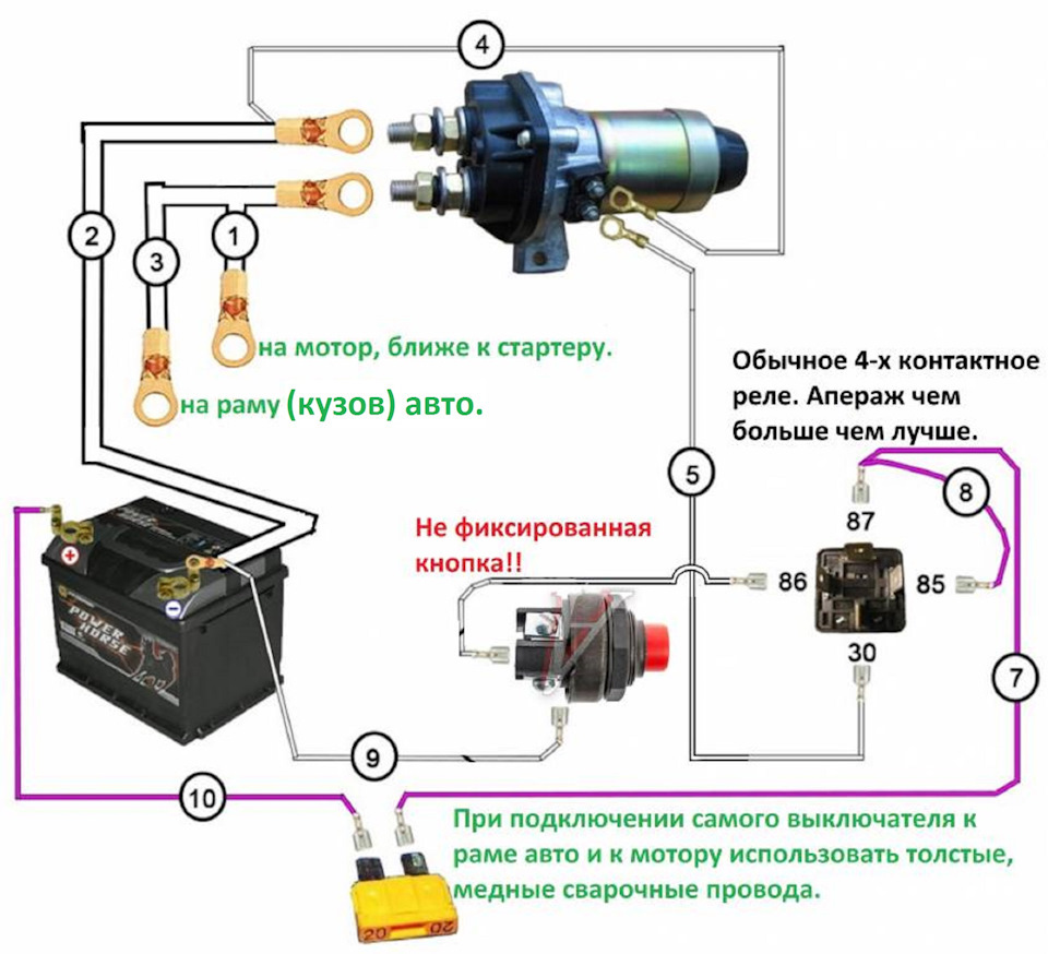 во первых силовые провода никто никуда тащить не будет (реле стоит прямо около АКБ) во вторых первопричиной "-" является АКБ, а не кузов (кузов с тем же успехом мог бы быть "+", но тогда он будет лучше гнить), а замыкается "+" с "-" а не просто "+" для этого мы и разрываем ("+" или "-" не важно) от АКБ до кузова, и естественно подразумевается что мотор при этом заглушен!