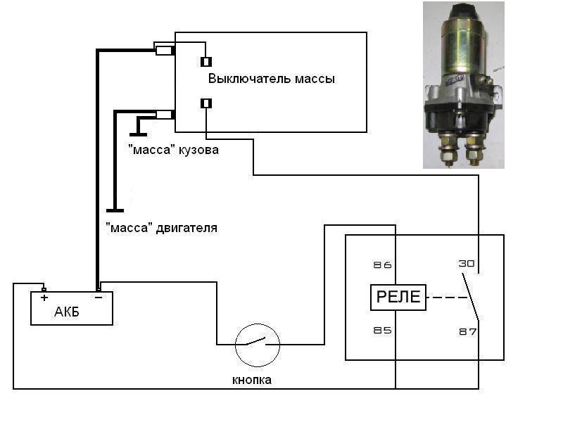 Важно что бы кроме одного провода от АКБ больше ни чего не шло иначе масса будет постоянно и при попытке завести автомобиль при выключенной массе провод тонкого сечения может оплавится и загореться это важный фактор в подключении!