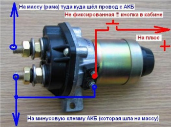 Далее тянем два провода в салон один от второго контакта управления, второй от плюсовой клеммы АКБ и соединяем их с помощью кнопки, желательно взять ту же кнопку от Камаза она довольно мощная и можно обойтись без реле, провод берем примерно 2.5Кв/мм это для силовых управляющих контактов для управления реле можно взять провод на много меньшего сечения