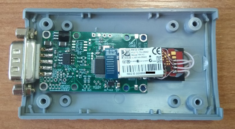 Устройство собрано на LPC11C14, без Ардуин. Здесь имеем 32-битное ядро Cortex-M0, работающее на частоте 48МГц, а так же аппаратный CAN на самом контроллере, что позволяет без каких-то дополнительных ухищрений обрабатывать любые данные, поступающие с шины. Bluetooth модуль можно использовать практически любой, поддерживающий профиль SPP, в том числе не брендовый (на фото Roving RN-42), а любой распространенный китайский noname, типа HC-04/HC-05.