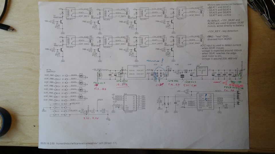3. да: моторы под креслом, плата сбоку. Но у кресла отдельный земляной провод (что и позволяет детектировать крайние положения). По земле мрак что бегает — импульсы в десятки (!) вольт