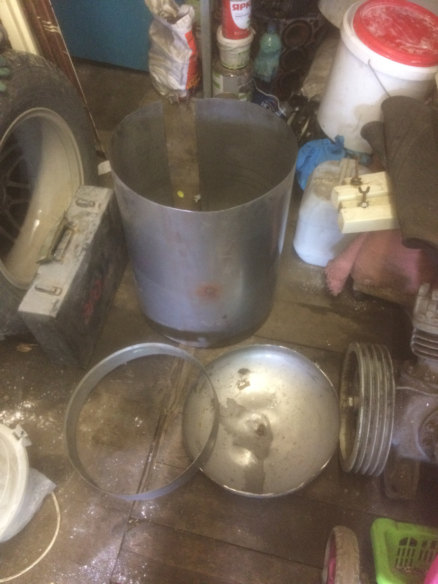 Бак был на 70 литров. срезал эллиптическое днище и немного сверху, так как там отверстия были, но плюс немного объема пылесоса, — вот и выходит чуть больше 70 литров.