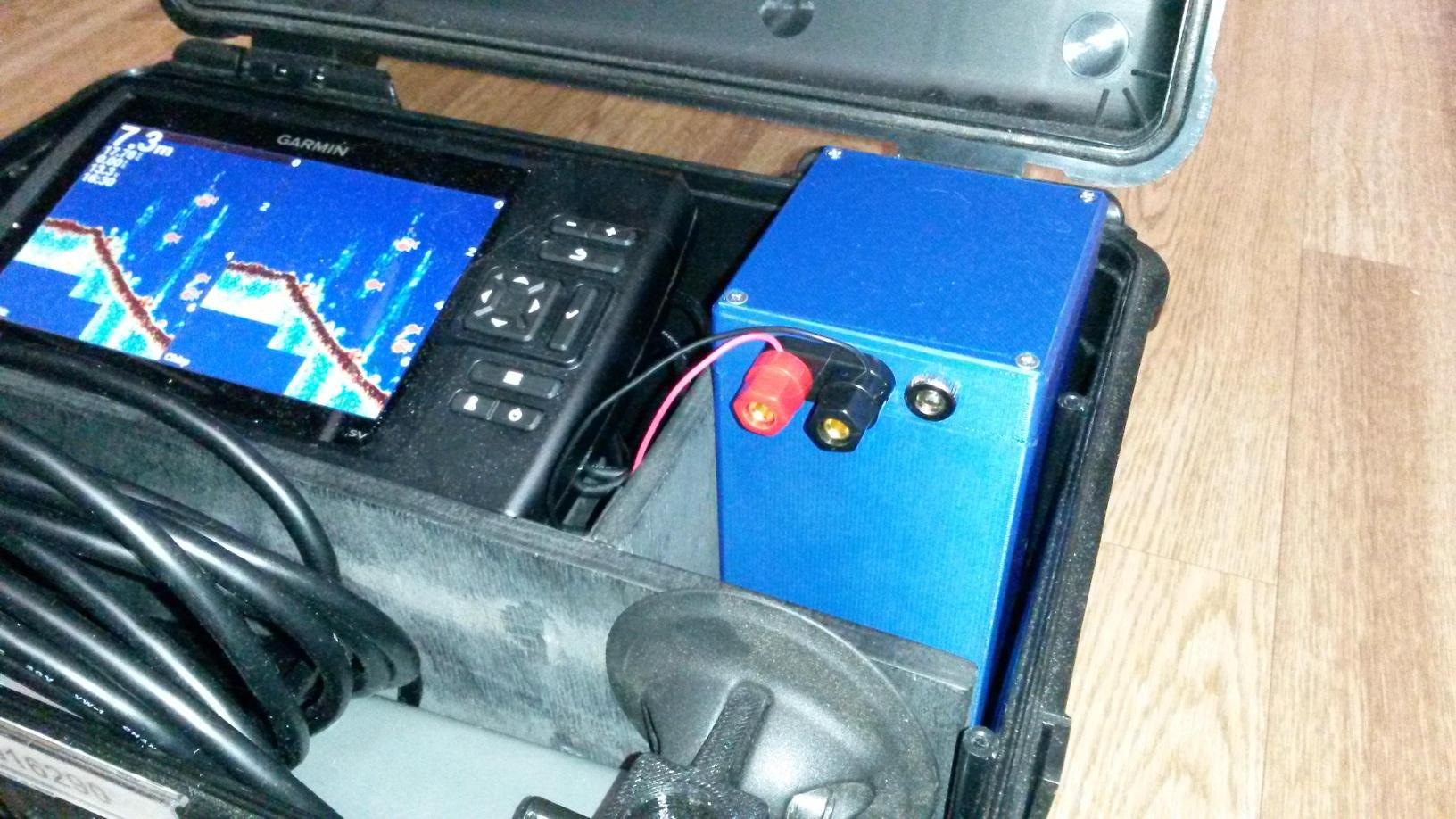 Для проверки времени работы на этом аккуме, подключил к эхолоту с активированным режимом бокового сканирования с подключенным датчиком (в этом режиме максимальное потребление 0.4 А).