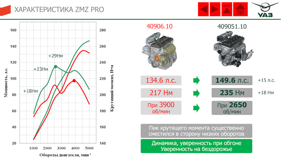 Мощность и момент у ЗМЗ 409 явно занижены, вот параметры обычного патриота немного доведенного до ума (железо сток), а судя по цифрам, новый недотягивает по мощности до нынешнего, и максимум момента почему то у нынешнего на 2500 а никак не на 3900 … Откуда все эти цифры в рекламе ? a.radikal.ru/a04/1804/b3/284596bf1382.jpg
