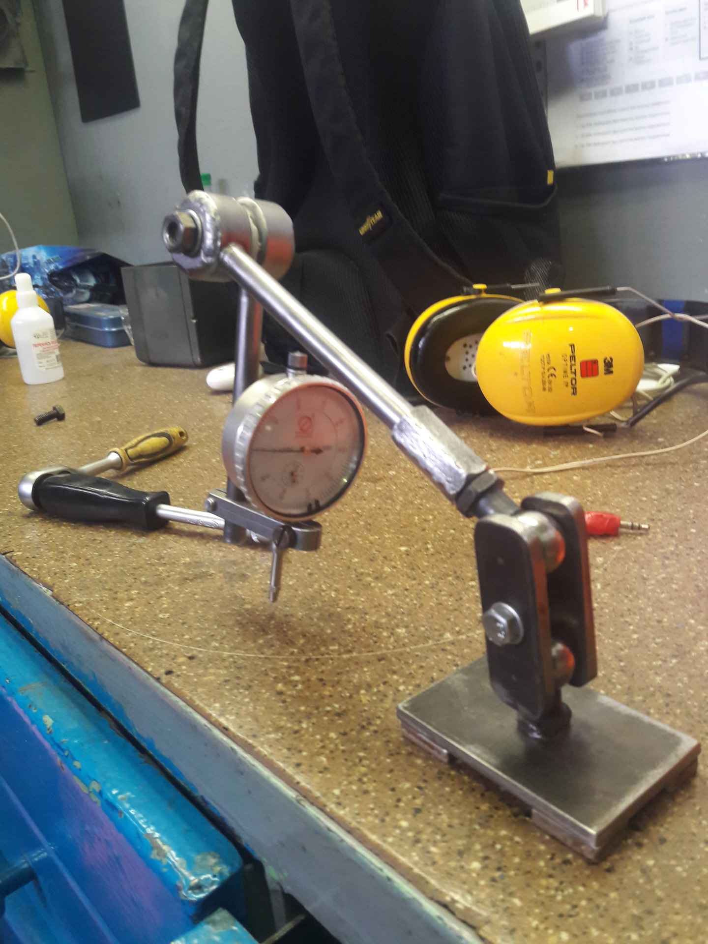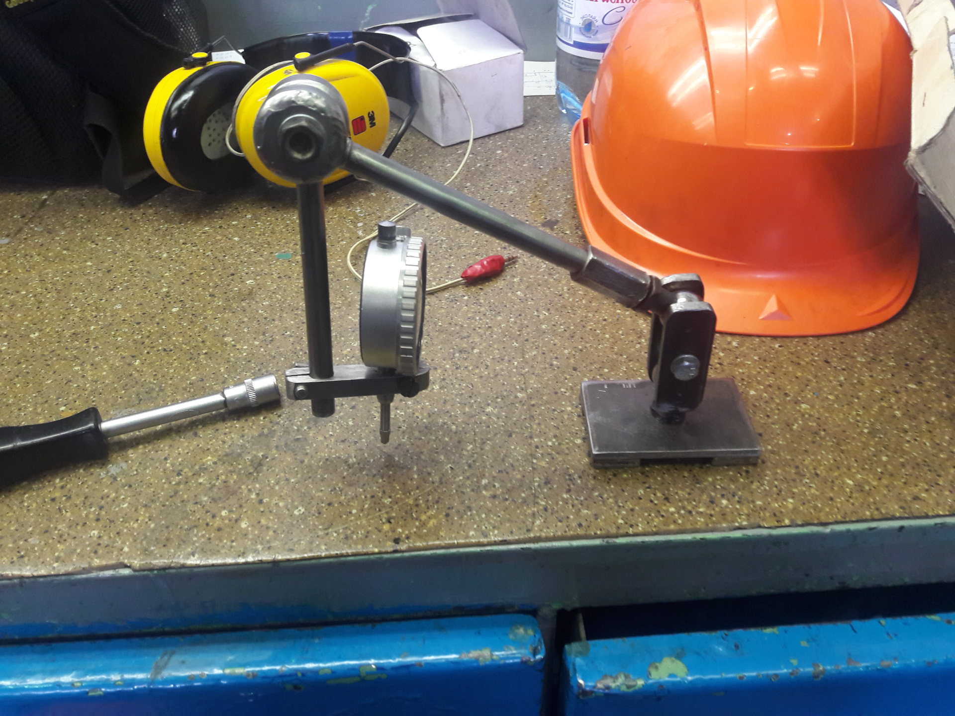 В основании 40×60 сделал отверстие на 10 нарезал резьбу 1,25 вкрутил шарнир. Снизу приклеил 4 магнита по углам. Держатель для индикатора изготовлен из шпонки электродвигателя. Ну и готовый результат. В планах индикатор сделать по типу шарнира ну это совсем другая история да и старой стойки нету)