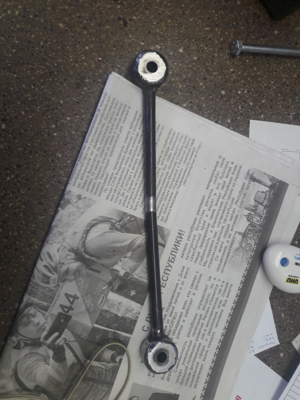 Собственно говоря появилась надобность в индикаторной стойке, проверить на биение тормозные диски. Ну и натолкнула меня мысль сделать из старой стойки стабилизатора. Что имеем 1 стойку в разобранном состоянии, 4 усиленые шайбы м8, 2 кусочка металла 6мм 20×60, и 40×60, и магниты.