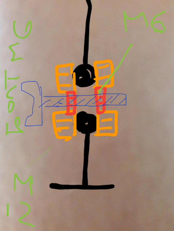Пользуйтесь) вместо пластин для регулировки шарниров я переделал на гайки. 2 гайки м6 и 4 гайки на 12 вроде не помню, сварил по три гайки на рисунке схематично показал не знаю поймешь или нет. Смысл тот же но доработан) одну гайку м 6 просверлил 6 сверлом чтоб болт свободно проходил и вкручивался вдругую