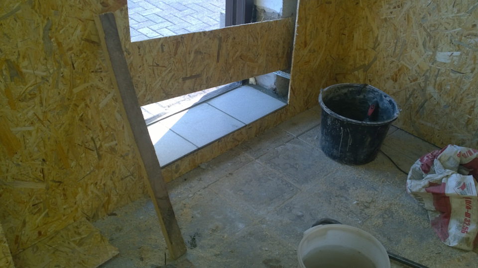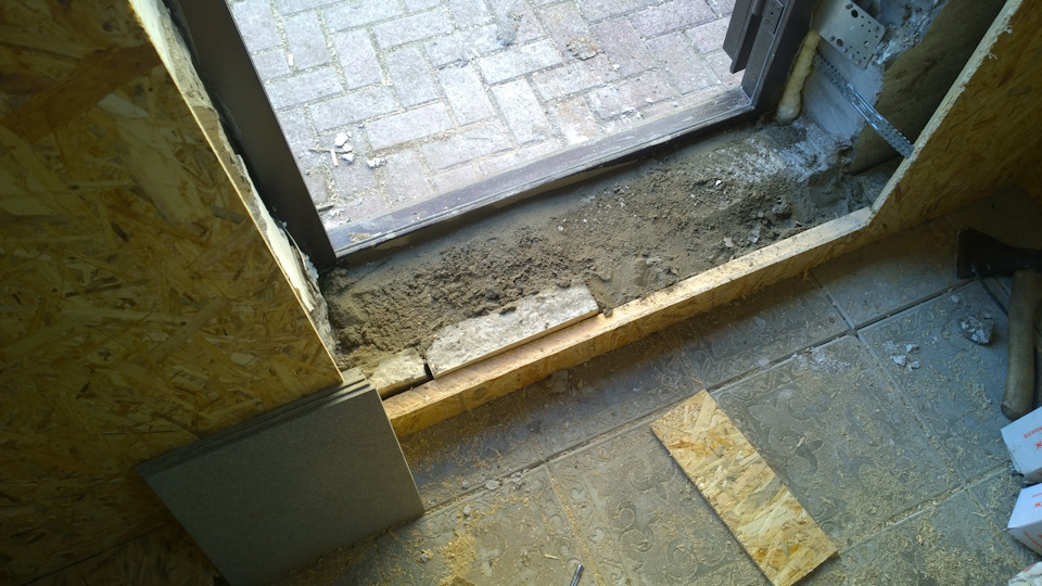 Порог решил сделать плиткой из керамогранита, предварительно заполнил все дыры обрезками от тротуарной плитки и раствором для кладки кирпича.