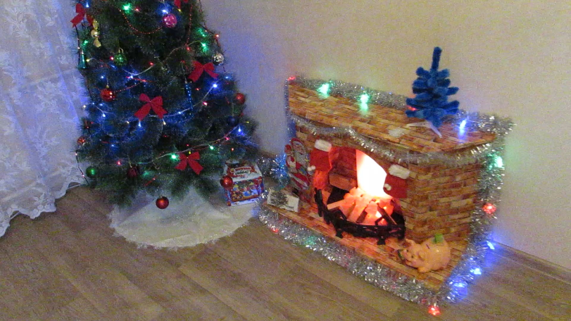 Дальше дело за малым выкладываем камни, добавляем пару настоящих деревяшек, ставим елку, украшаем все мишурой и гирляндами и любуемся.