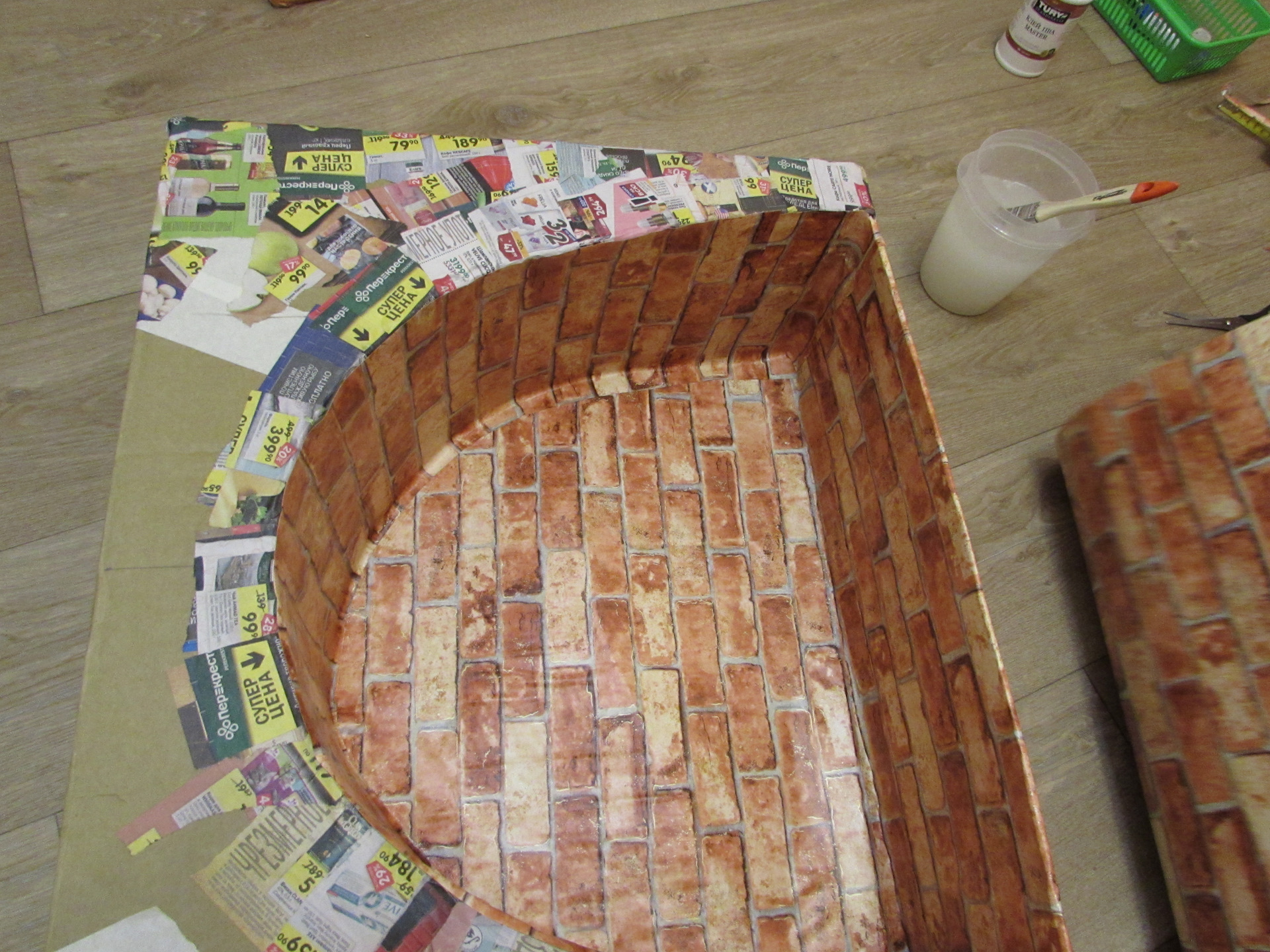 Чтобы усилить довольно хлипкую конструкцию применили технику, папье-маше, обрывки газет и клей пва. Подставка под камин сделана тоже из картона, как и крышка. Все эти детали обклеены обоями с рисунком кирпичной кладки.