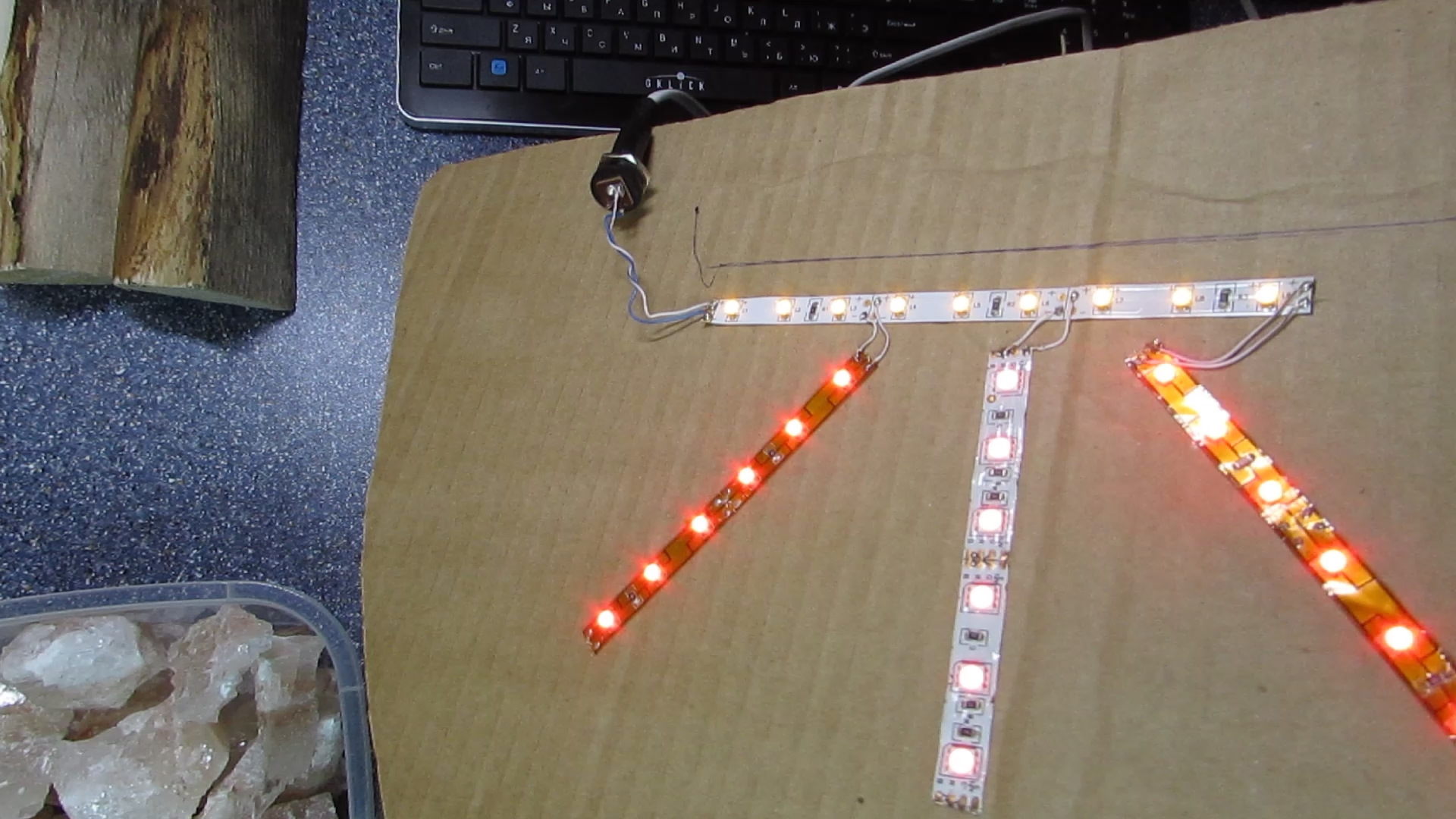 Далее а кусок картона наклеил светодиодные ленты, одну желтую остальные красные и склеиваем это с нашей поделкой из первой части.