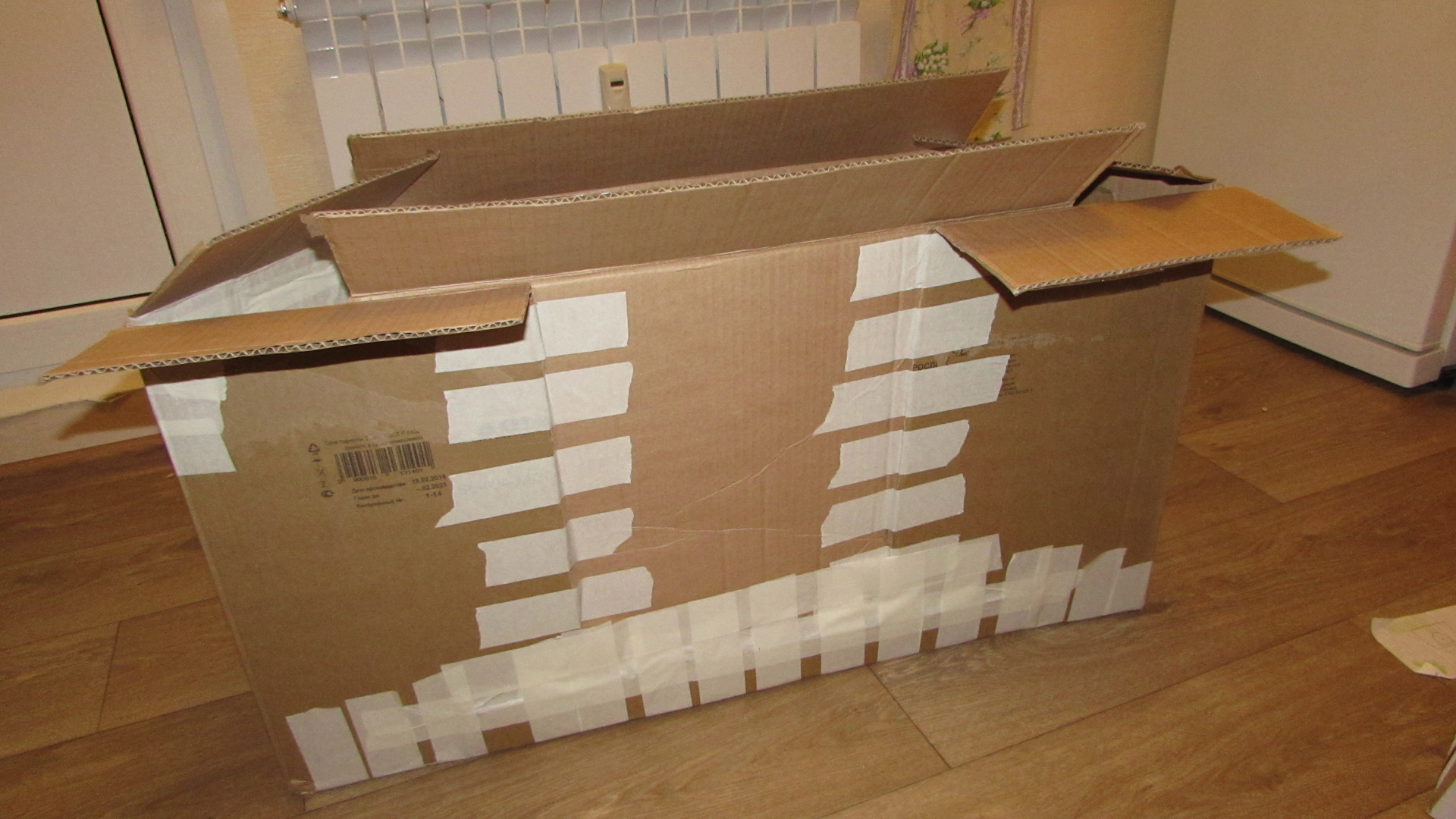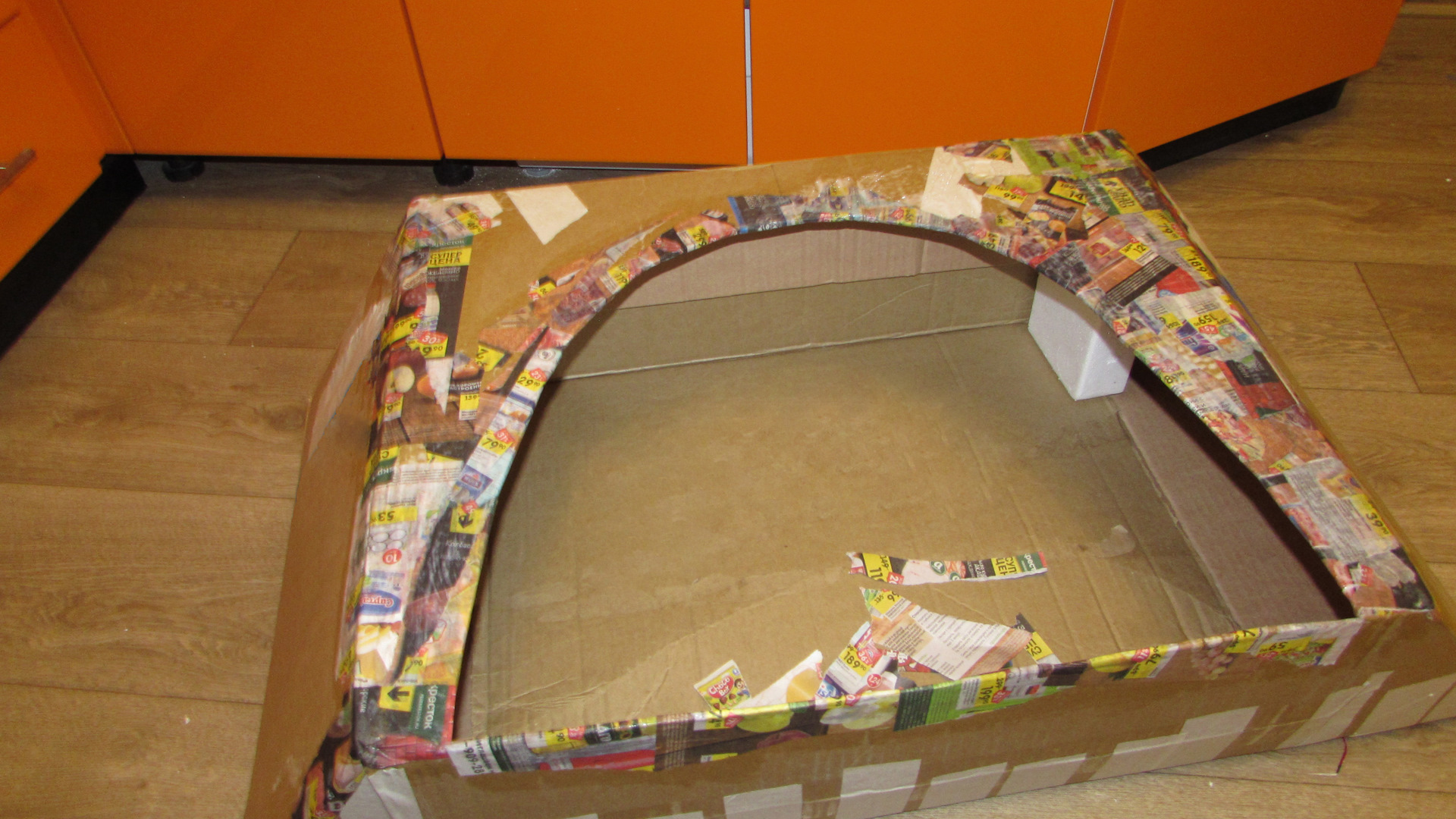 И так корпус камина сделан из картона, а точнее из коробок. Для топки взяли самую большую из имеющихся. Одну длинную сторону посередине разрезали и вставили еще кусок картона так, что бы из прямоугольника получилась трапеция.