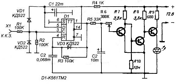 Вобщем, обдумав вариант с ЭПХХ, понял, что лучше воспользоваться схемой шифт-лайта. Это когда лампочка горит по достижении определенных оборотов, показывая, что надо переключать передачу. Потому как блок ЭПХХ работает в узком диапазоне оборотов. А нам надо именно предел. Нашел вот такую схемку. Если её запитать через терморегулятор, то получится комбинированное устройство, работающее только на горячем моторе и малых оборотах.